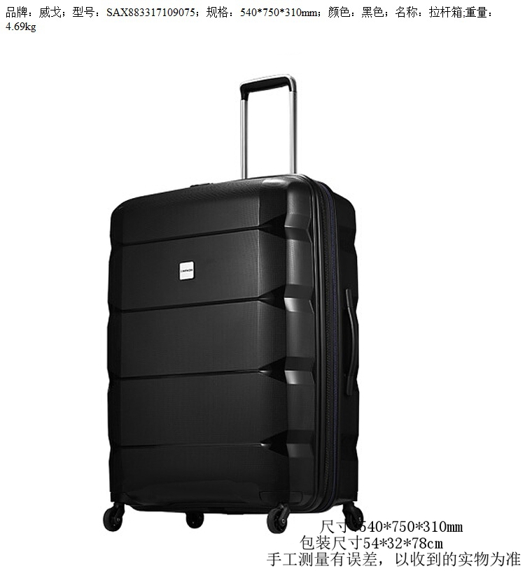 商品名称:威戈 540*750*310mm 拉杆箱 黑色 SAX883317109075