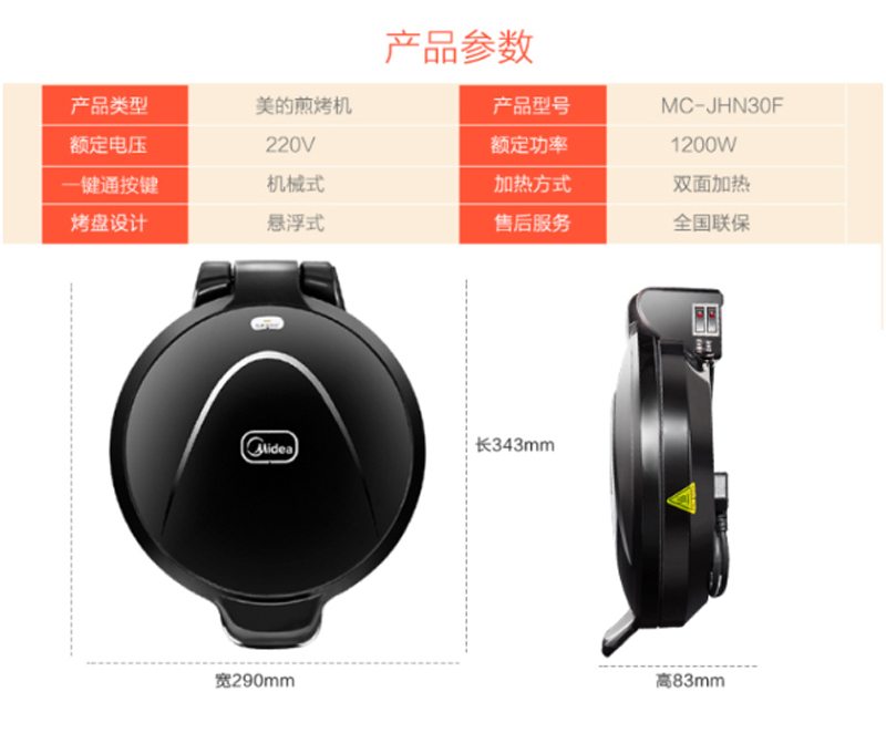 商品名称:美的(Midea)电饼铛家用智能双面加热煎烤机烙饼机三明治早餐机蛋饼机薄饼机煎饼烙饼锅JHN30F (单位:台)