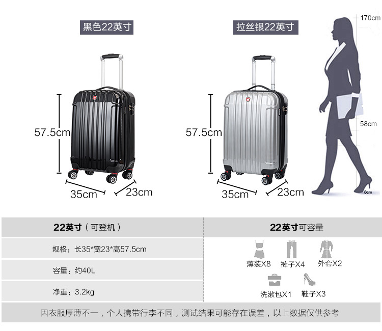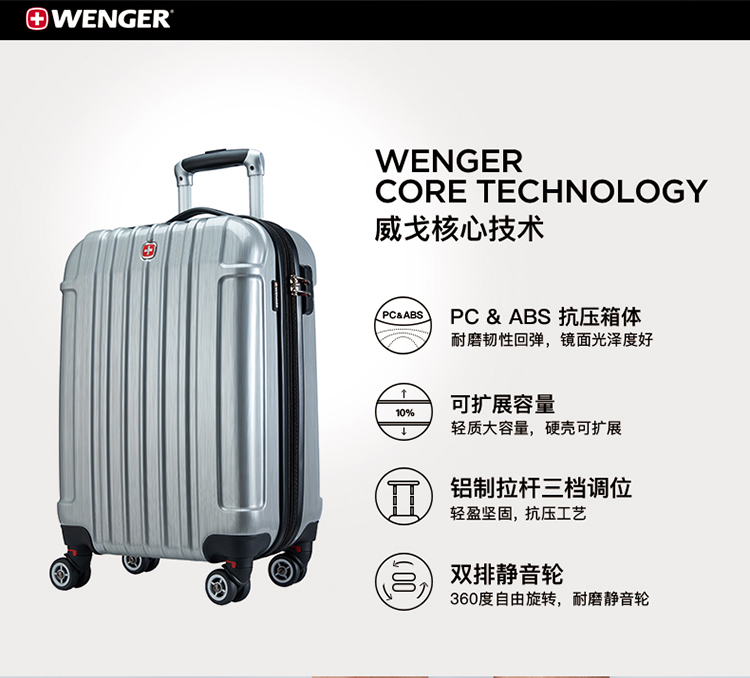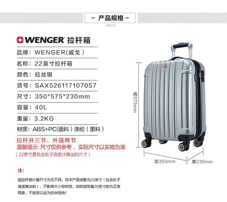 商品名称:威戈 拉杆箱登机箱旅行箱 22英寸拉丝银 SAX526117107057