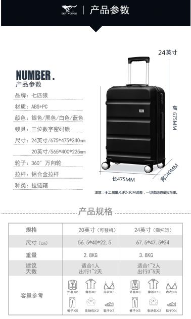 商品名称:七匹狼 SEPTWOLVES QPL810118-A24 拉杆箱 24英寸 675×475×240MM 黑色