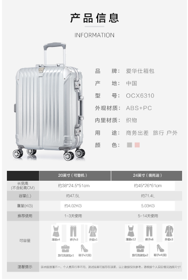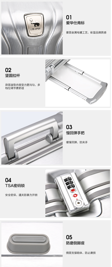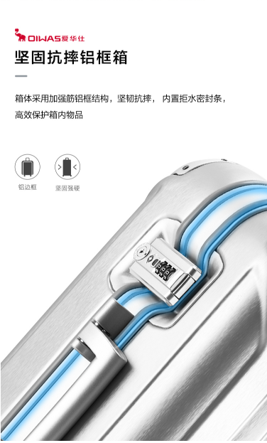 商品名称:爱华仕 OIWAS ABS+PC硬箱飞机轮拉杆箱6310铝框海关密码锁行李箱商务出差旅行硬箱24英寸银色