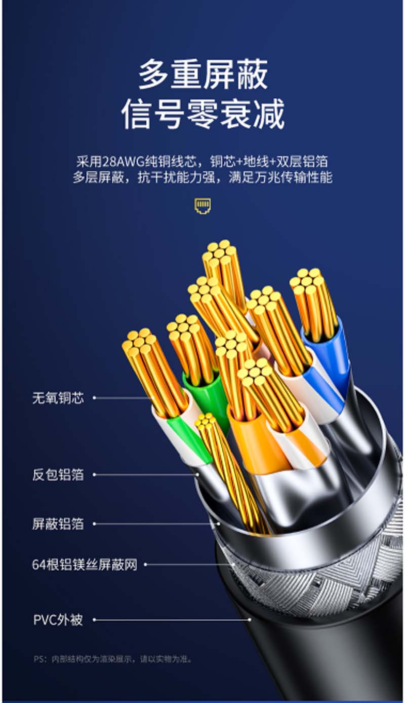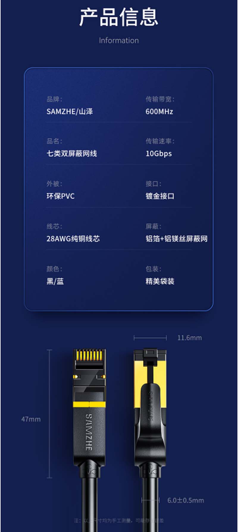 商品名称:山泽 SAMZHE CAT-7015H 工程级七类CAT7类纯铜镀金双屏蔽超高速网络跳线 成品网线 黑色1.5米