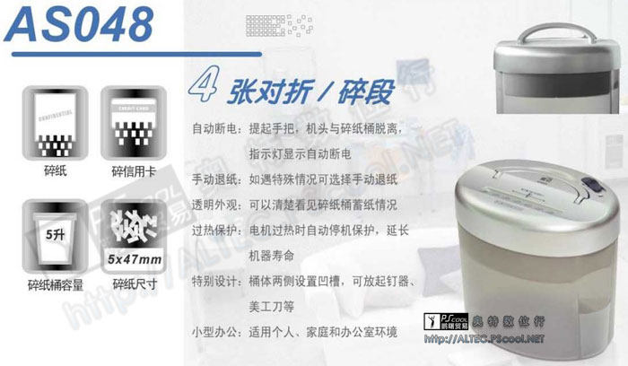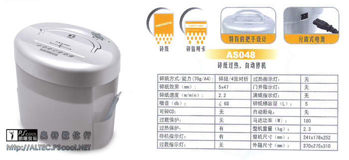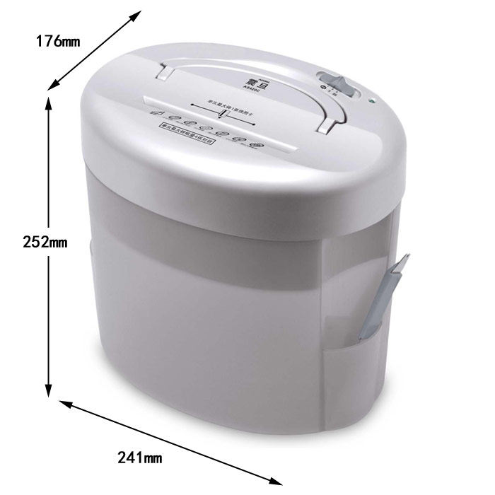 | 震旦 碎纸机- AS048特点:1、外观小巧,适合家庭、个人桌上使用;2、提手设计,处理纸屑十分方便;3、机身两侧设储物槽,便于放置笔、起钉器、美工刀等办公用品;4、透明纸筒设计,能让使用者清楚地看清纸筒的蓄纸状况。震旦AS048一般规格碎纸方式条状碎纸效果5×47mm碎纸宽度230mm震旦AS048电气指标电源200-240V AC, 50/60Hz噪音60dB震旦AS048外观参数重量2.25kg长度241mm宽度176mm高度252mm | |
