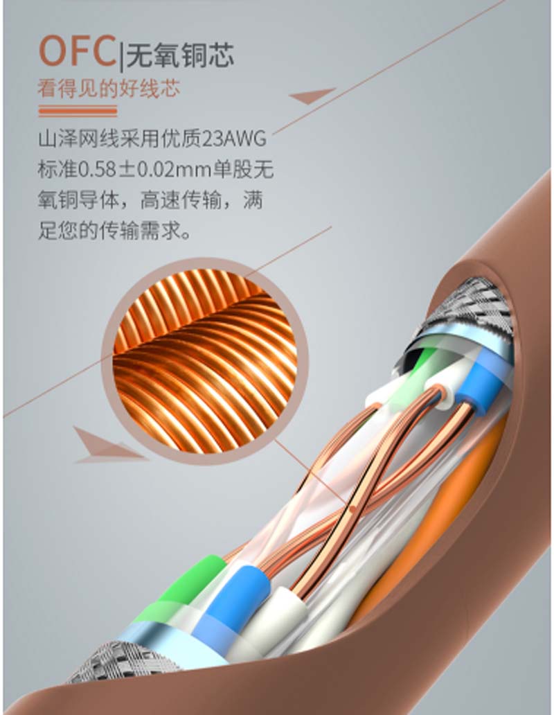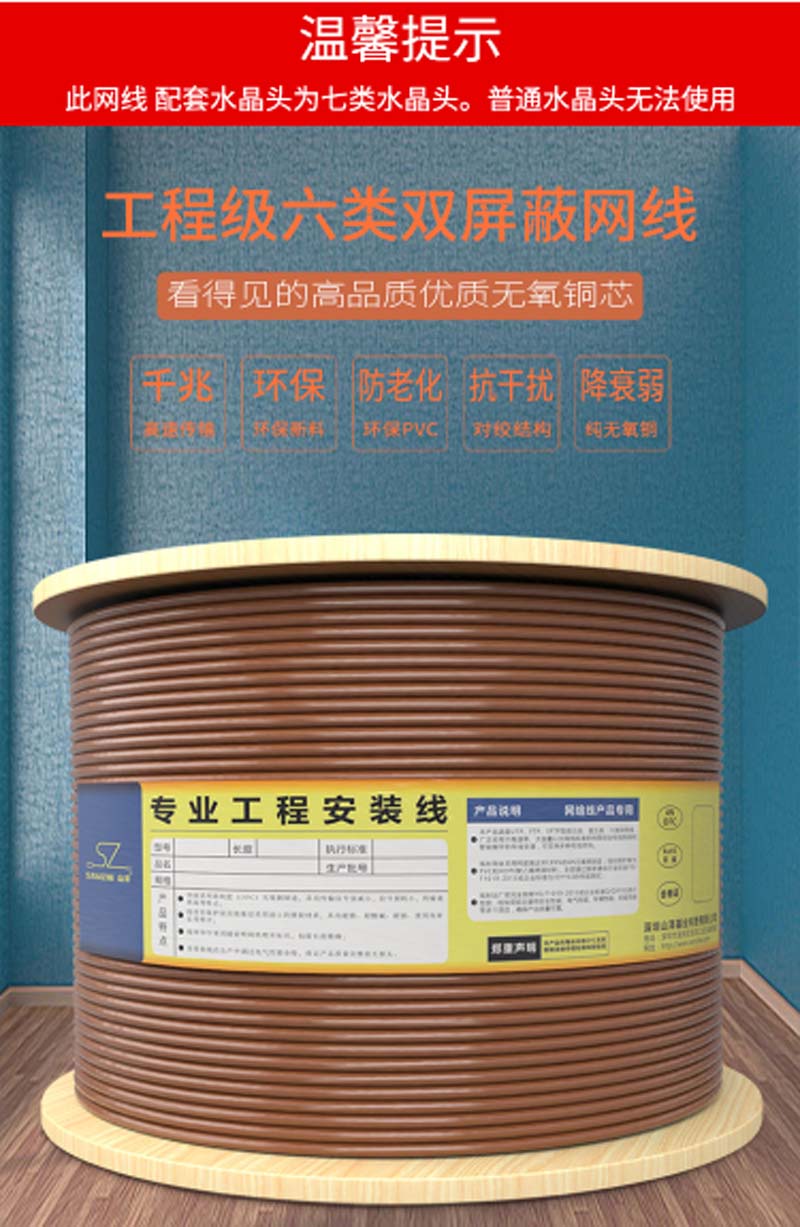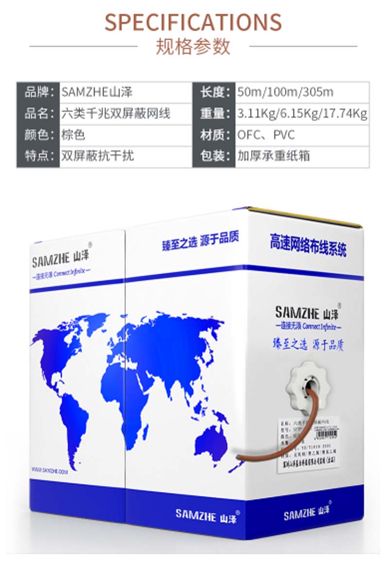 商品名称:☆山泽 SAMZHE CAT6六类千兆双屏蔽抗干扰降衰无氧铜高速网线 100米/箱 棕色 SFTP-6100