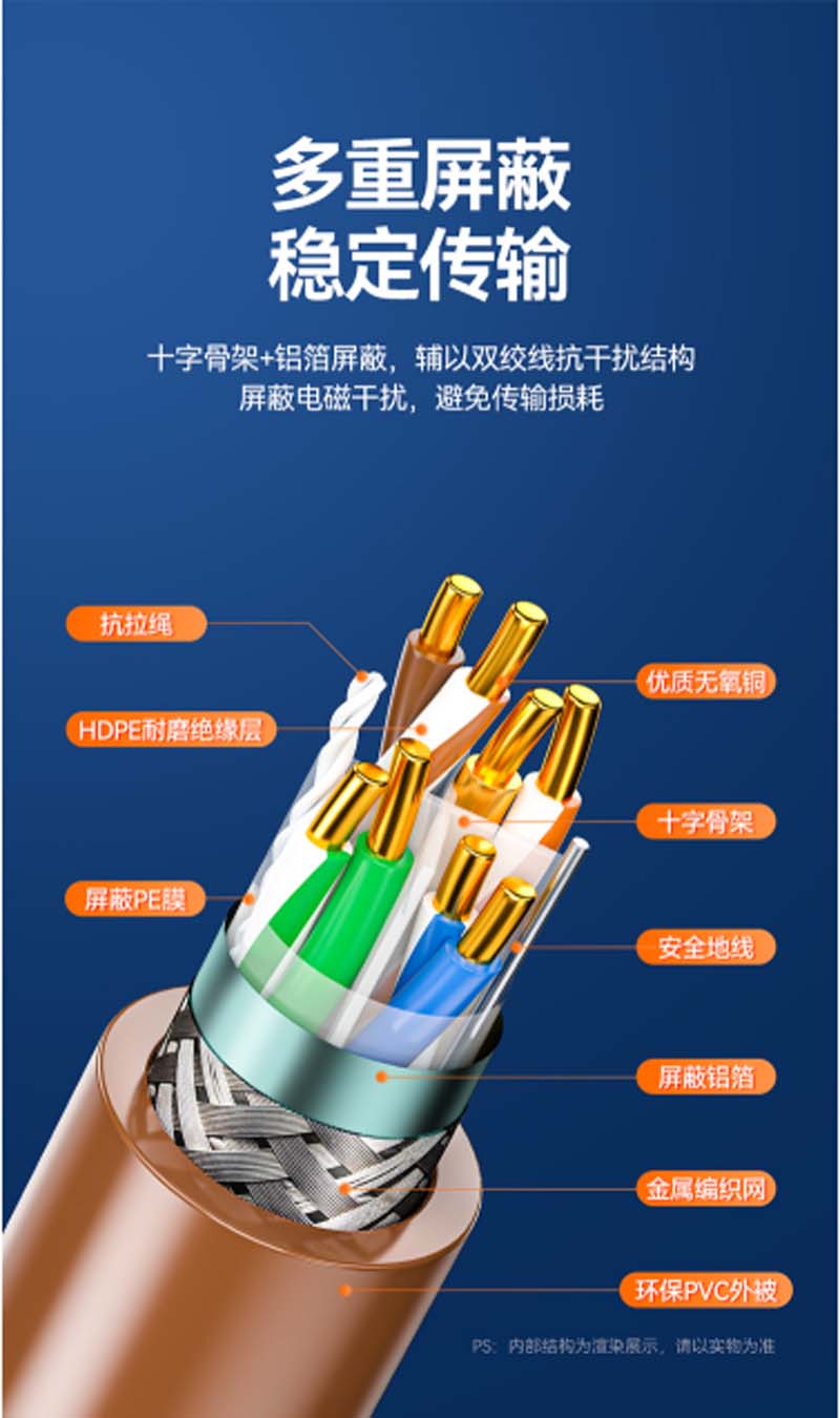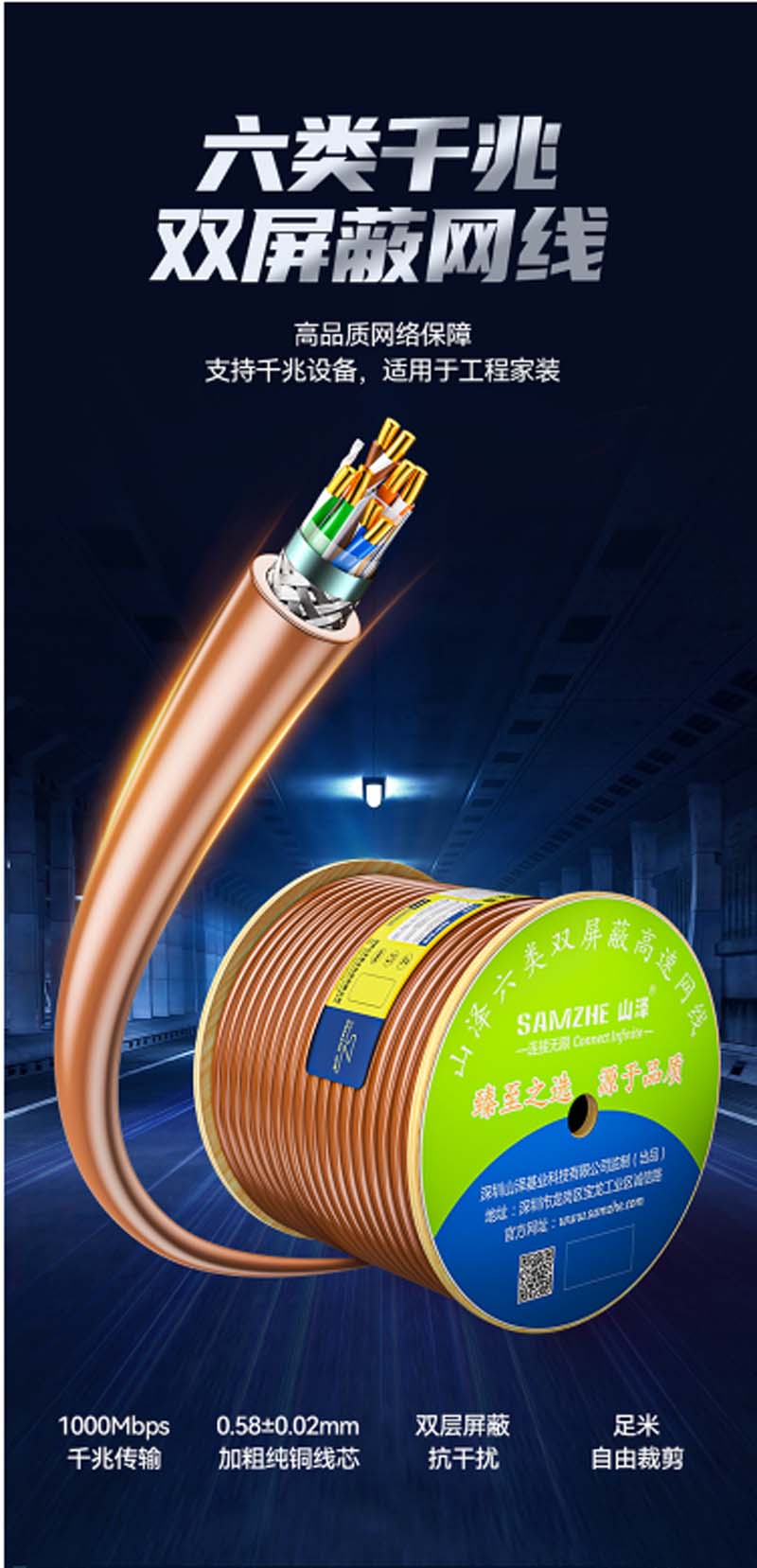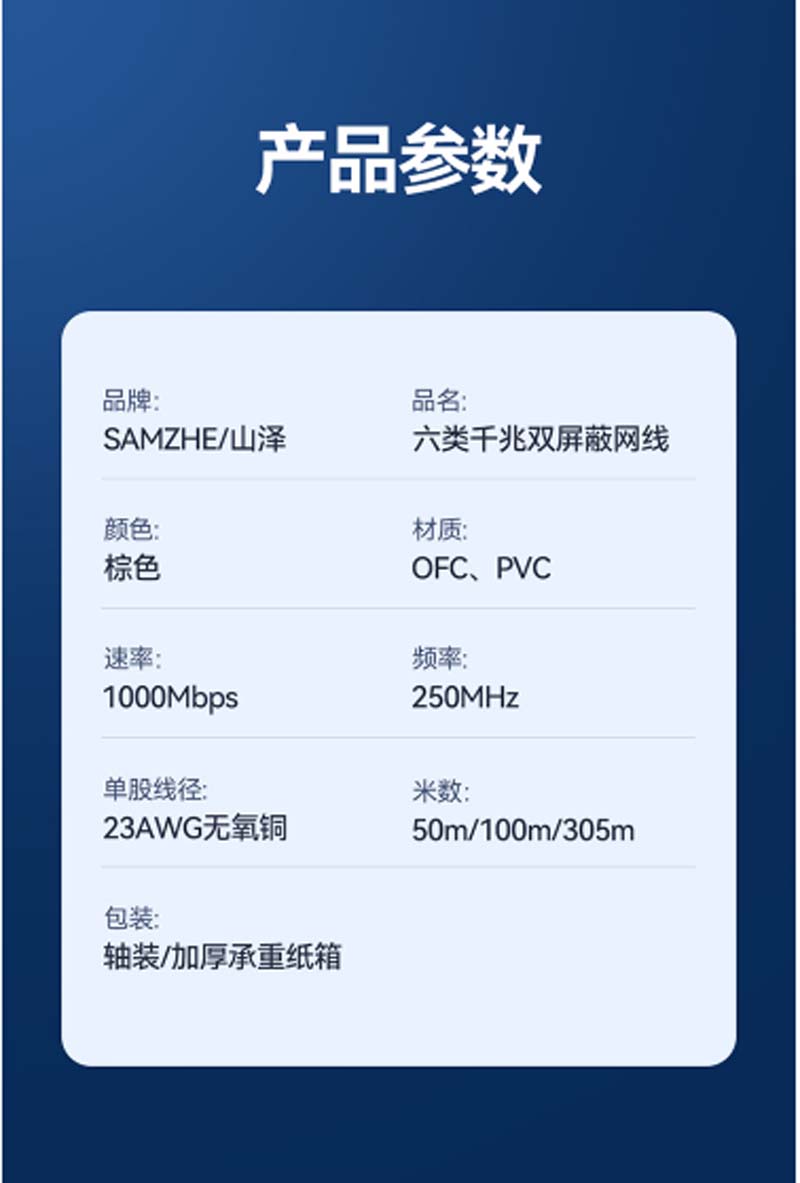 商品名称:☆山泽 SAMZHE CAT6六类千兆双屏蔽抗干扰降衰无氧铜高速网线 50米/箱 棕色 SFTP-6050