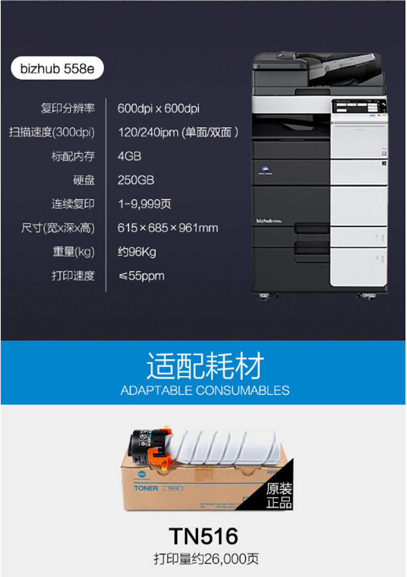 商品名称:☆柯尼卡美能达(KONICA MINOLTA) 558E (双面器/双面自动输稿器/有线网络打印/1000页) 复印机