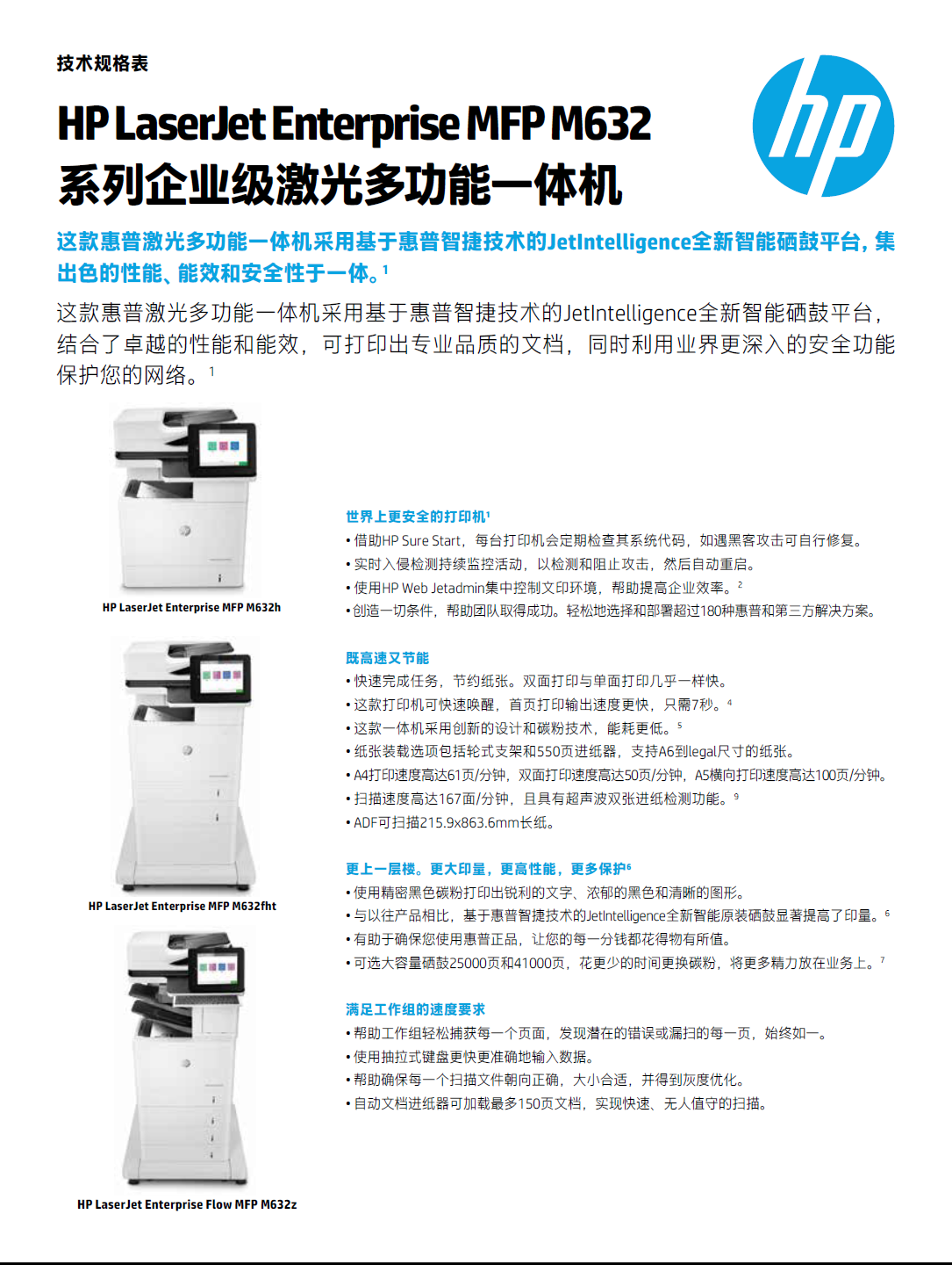 商品名称:☆惠普(HP) M632Z (双面器/双面自动输稿器/有线网络打印/1650页) 复印机