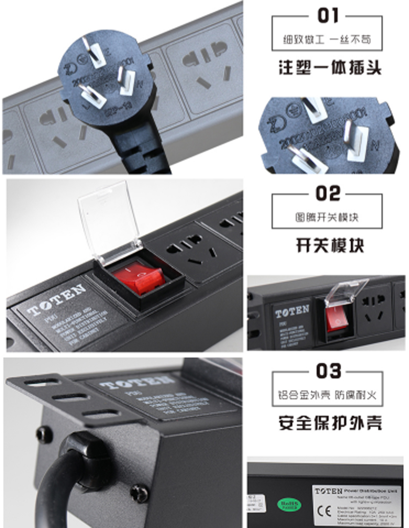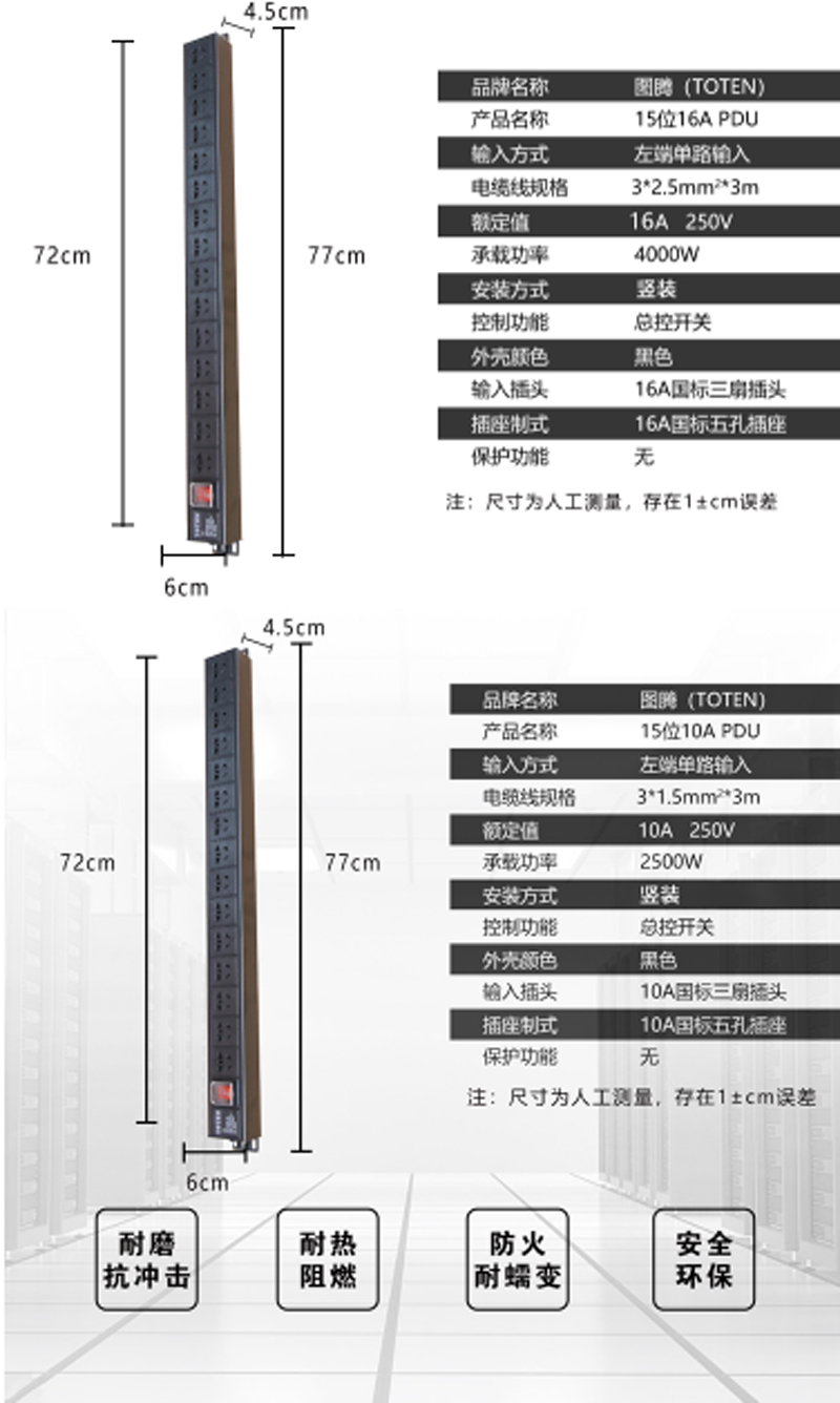 商品名称:☆图腾 TOTEN 国标15位PDU机柜插座 16A工业插排连接器 线长3M