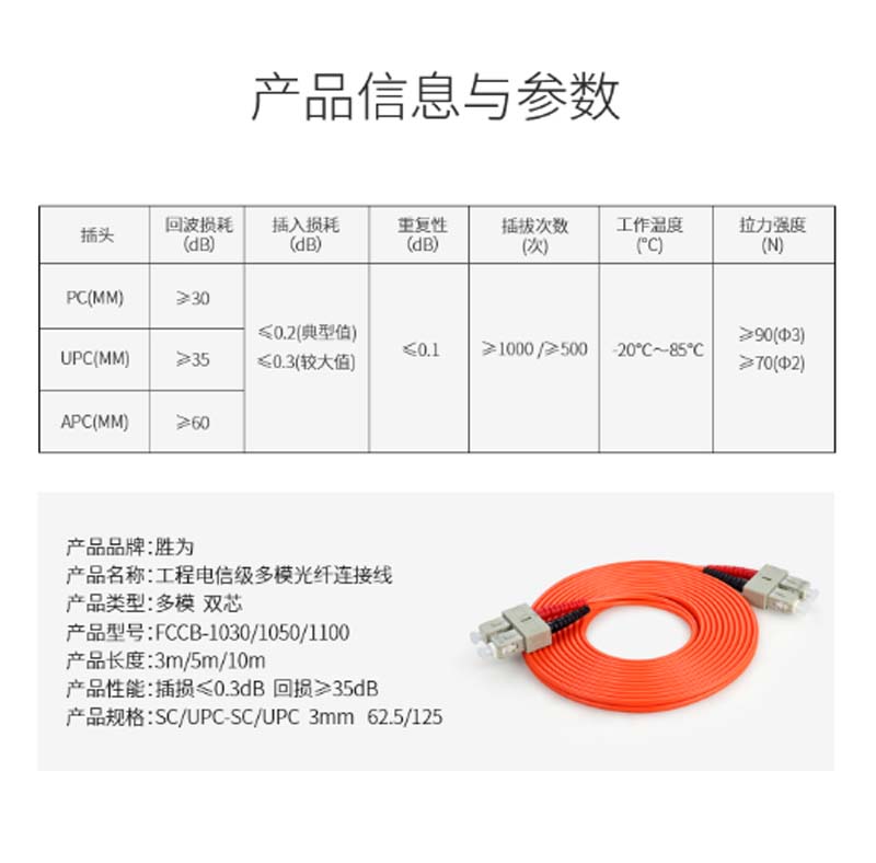 商品名称:☆胜为 SHENGWEI FCCB-1030 工程电信级光纤跳线 SC(UPC)-SC(UPC)多模双芯 3米