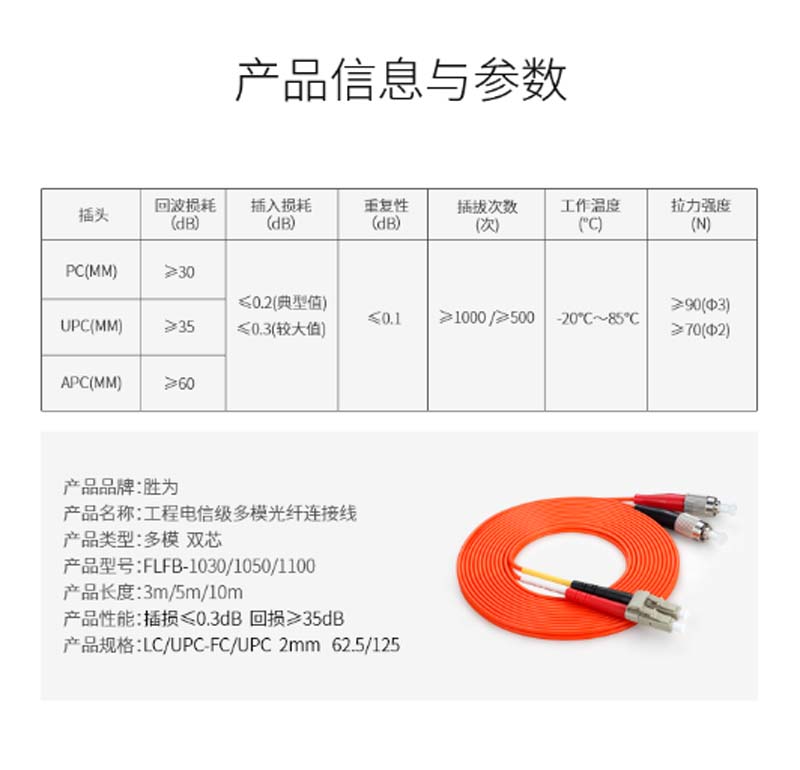 商品名称:☆胜为 SHENGWEI FLFB-1050 工程电信级光纤跳线 LC(UPC)-FC(UPC)多模双芯 5米