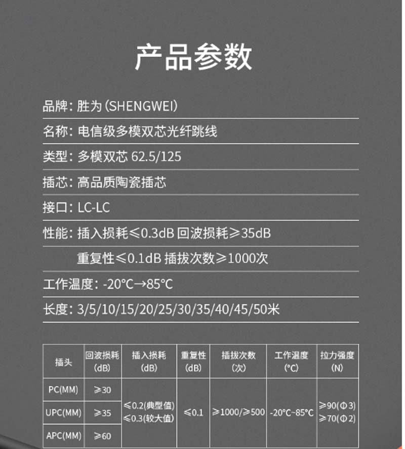 商品名称:☆胜为 SHENGWEI FMC-404 电信级光纤跳线 优质进口插芯 LC-LC多模双芯 收发器尾纤 5米