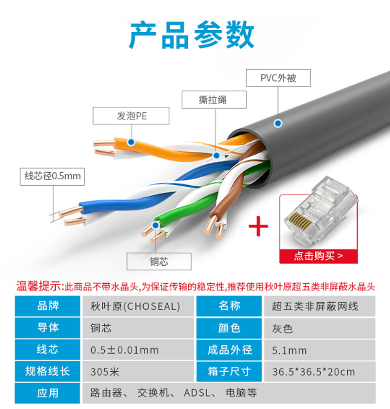 商品名称:☆秋叶原 CHOSEAL QS2602AT305 超五类网线 普通版 送20个水晶头 305米