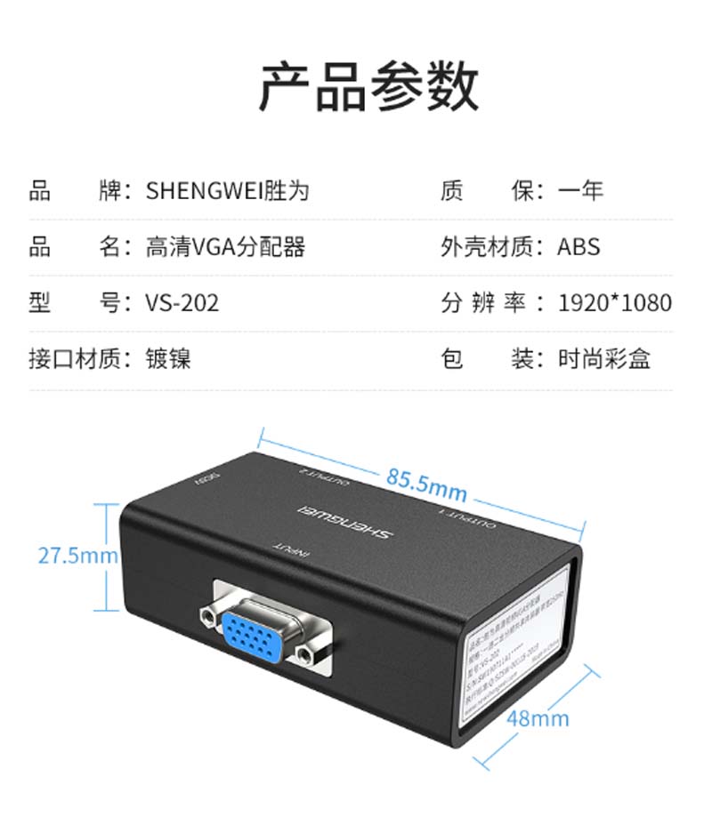 商品名称:☆胜为 SHENGWEI VS-202 VGA分配器 一进二出 2口共享器