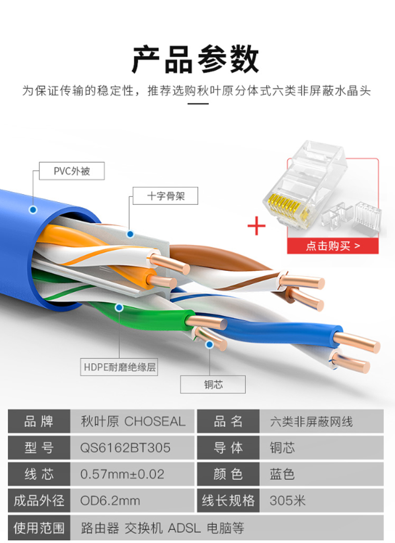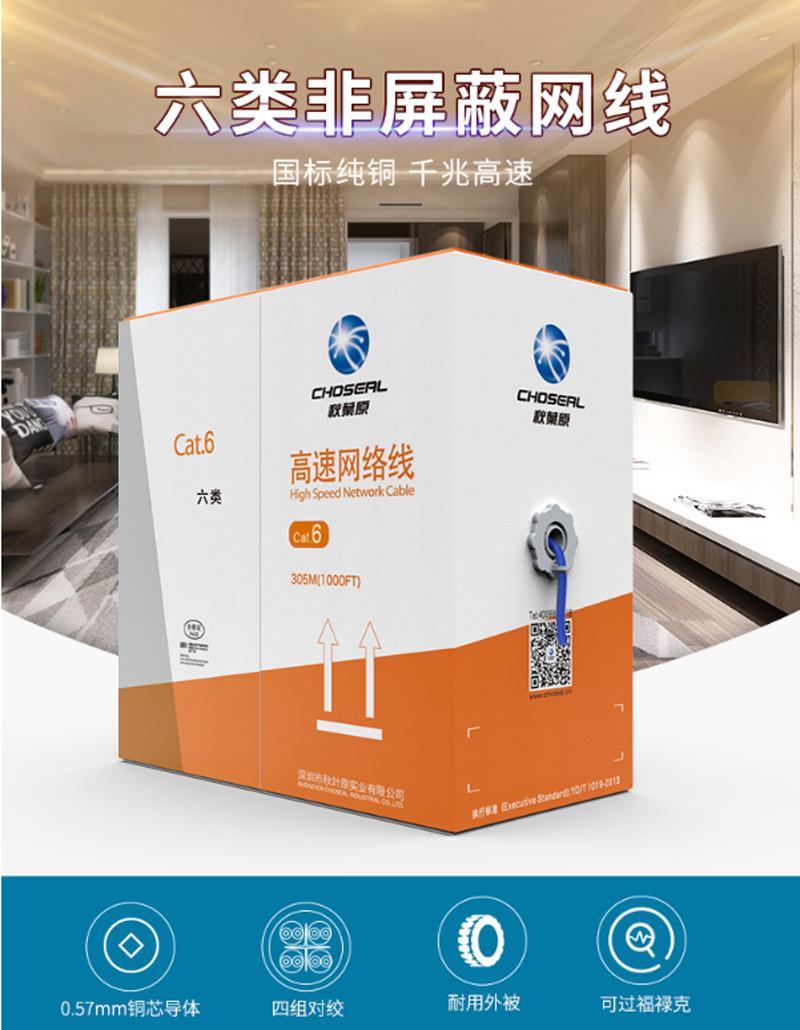 商品名称:☆秋叶原 CHOSEAL QS6162BT305 国标纯铜千兆六类网线 蓝色 305米 商用版