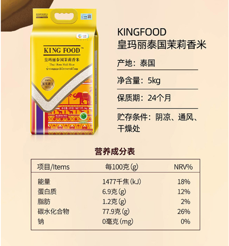 商品名称:中粮 KINGFOOD皇玛丽泰国茉莉香米5kg(单位:袋)