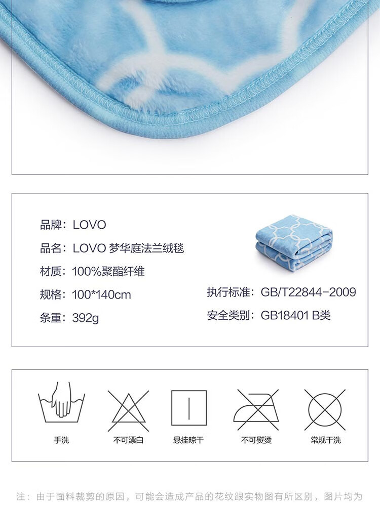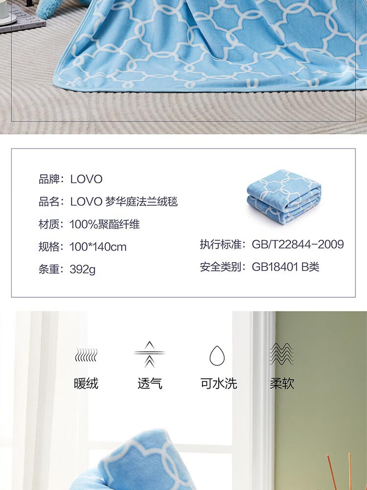 商品名称:LOVO 乐蜗家纺罗莱生活 梦华庭法兰绒毯 (单位:条)起订量 300条