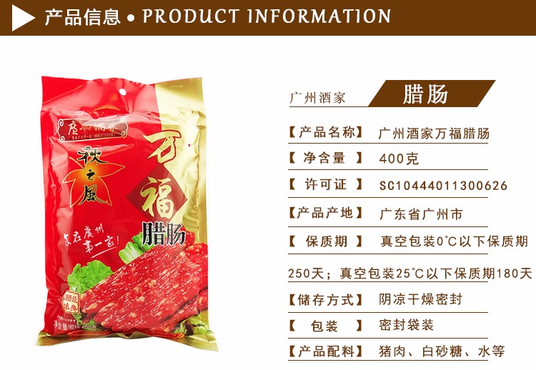 商品名称:广州酒家 万福腊肠400g (单位:袋)起订量100盒