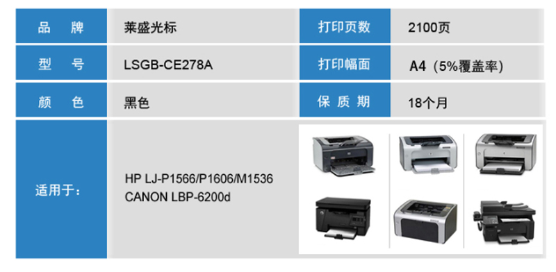商品名称:莱盛光标(LSGB)-CE278A-粉盒-适用-HP/LJ-P1566/P1606/M1536-黑色-单位:支