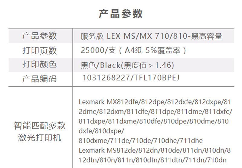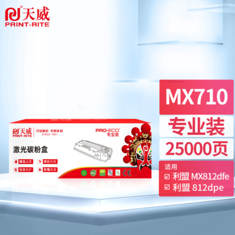 商品名称:天威 LEX MS/MX 710/810 专业装适用于-黑高容量粉盒带芯片单位:个