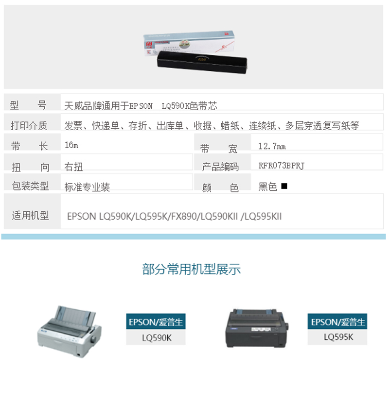 商品名称:天威-LQ590K-色带(色带芯)适用于爱普生LQ590 595K-色带芯:16M*12.7MM-黑色单支-单位:支-起订量5