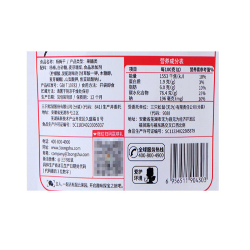 商品名称:三只松鼠 松鼠云果园杨梅干106g*3袋 单位:袋