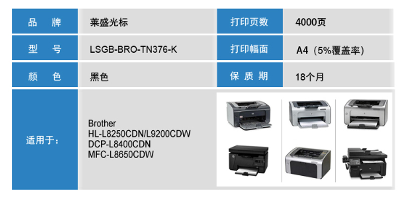 商品名称:莱盛光标(LSGB)-BRO-TN376-K-粉盒-适用于/Brother HL-L8250CDN/L9200CDW/DCP-L8400CDN/MFC-L8650CDW-单位:个