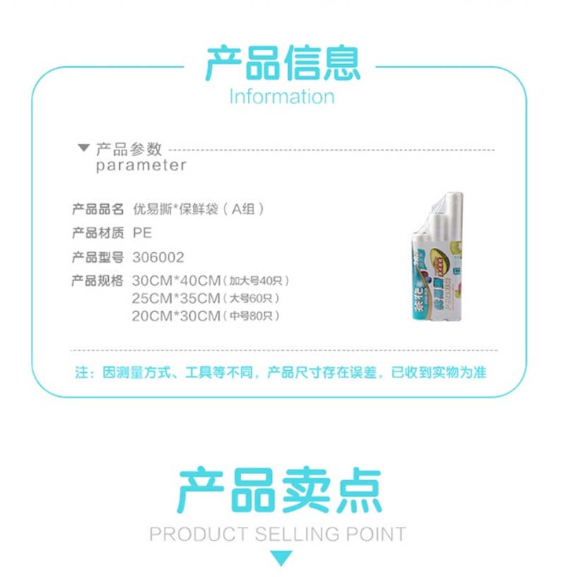 商品名称:茶花-306002-优易撕*保鲜袋(A组)-PE-独立装-单位:个-起订量3条