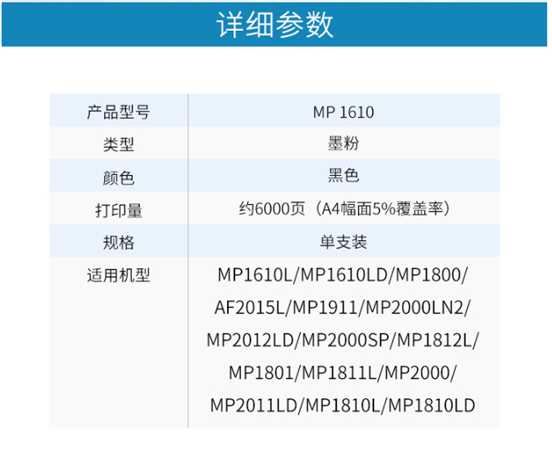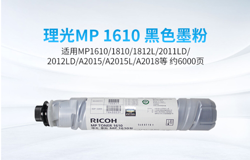 商品名称:理光(Ricoh)-MP-1610-墨粉适用MP1610/1810/1812L/2011LD/2012LD/A2015/A2015L/A2018-约6000页单支装-黑色-单位:盒