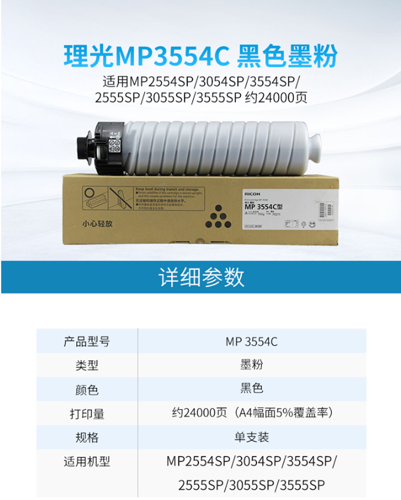 商品名称:理光(Ricoh)-MP3554C-墨粉适用MP2554SP/3054SP/3554SP/2555SP/3055SP/3555SP-约24000页单支装-黑色-单位:盒