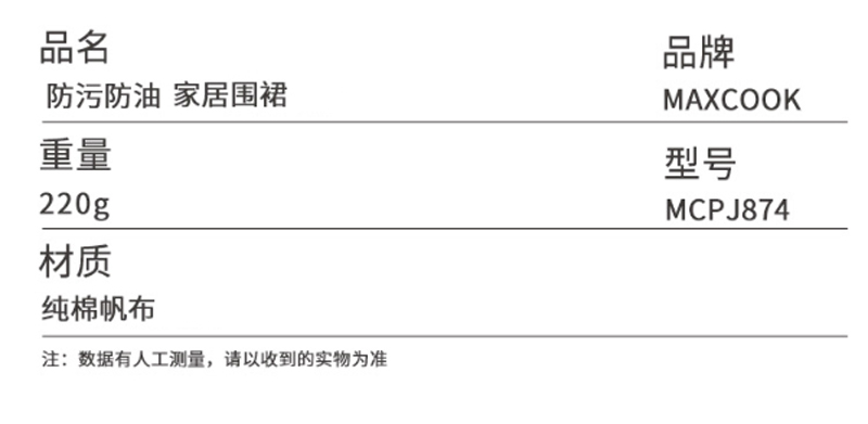 商品名称:美厨(maxcook)-MCPJ874-围裙-加厚全棉帆布厨房围裙-防污防油家居围裙-单位:个