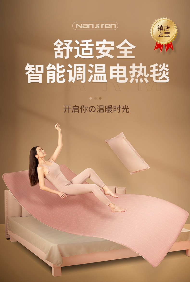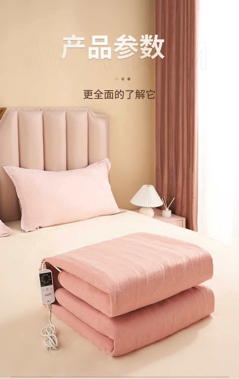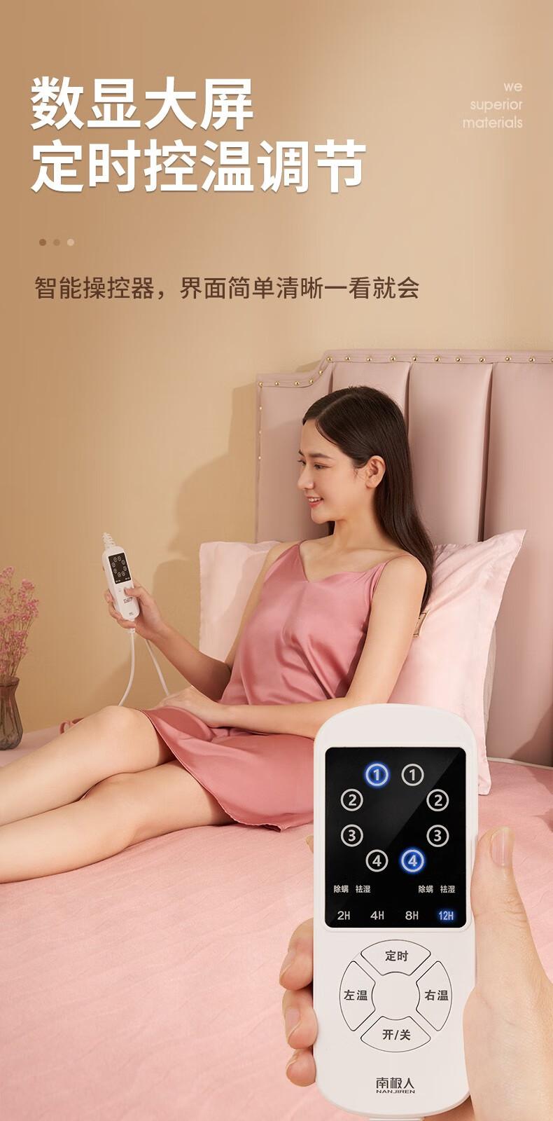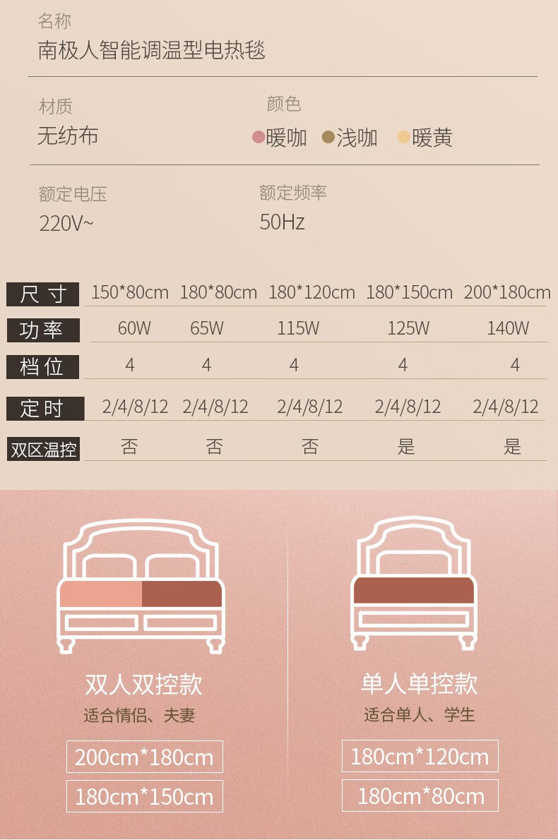 商品名称:南极人(Nanjiren)-880220-双人双控 除螨除潮 过热断电-电热毯-功率125W 商品尺寸180*150cm-单位:床