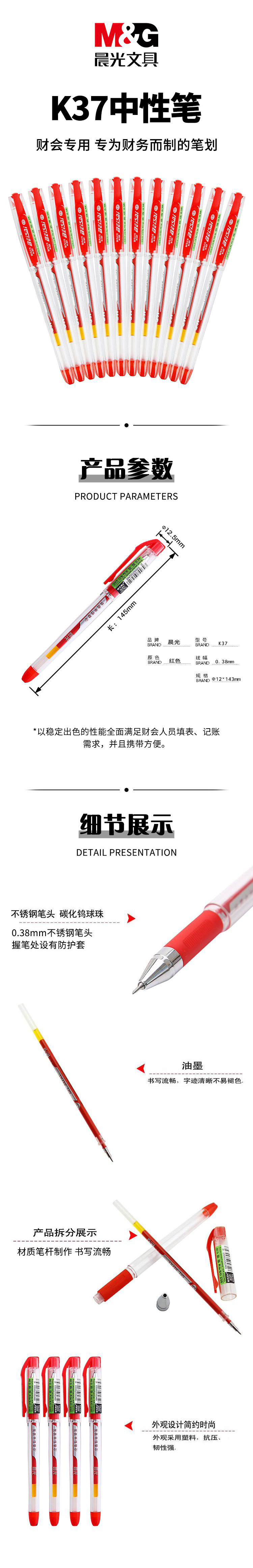 商品名称:晨光 M&G K37 中性笔 0.38mm 红 12支/盒 计价单位:盒