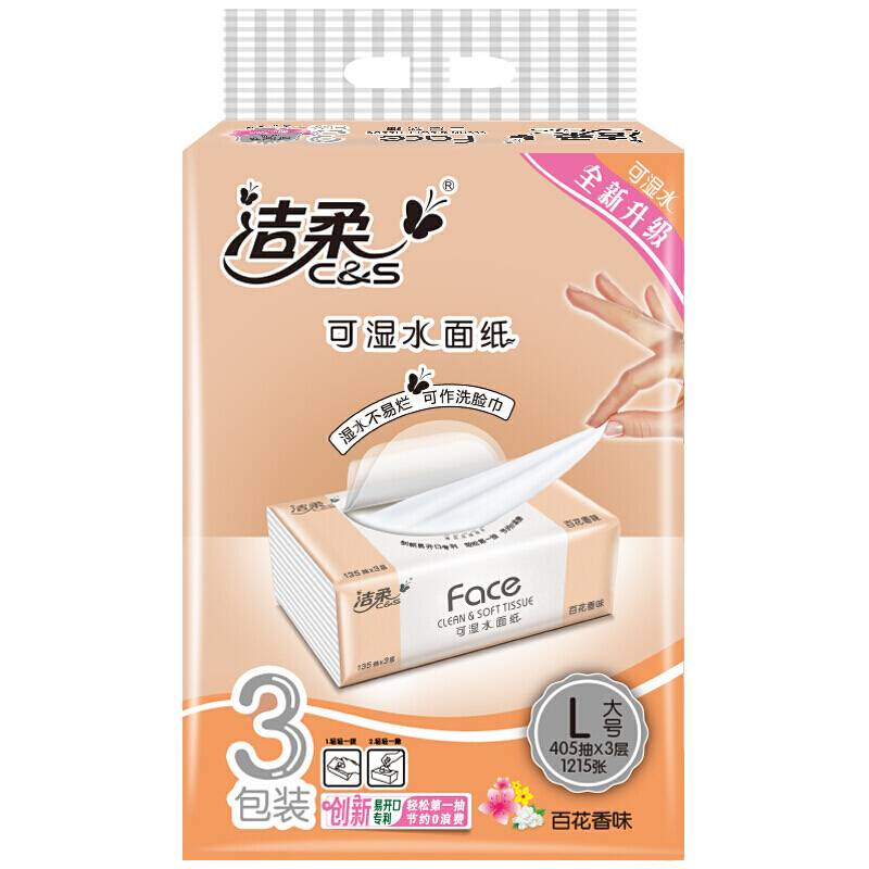 商品名称:洁柔 柔韧3层135抽面巾纸*3包/提 L大号纸巾 可湿水(白色)