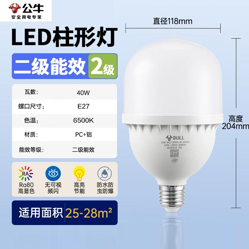 商品名称:公牛 节能灯螺口led灯泡超亮电灯泡e27灯泡大螺旋口柱形灯泡吊款灯具 【二级能效】40W 白光 E27螺口 单位:个