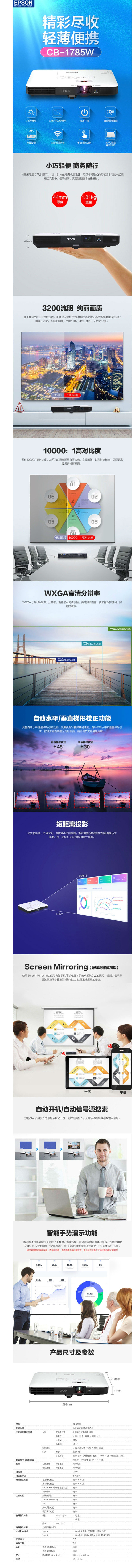 商品名称:爱普生(EPSON)-CB-1785W-投影仪-(高清 轻薄便携 无线投影 短距离投影 屏幕镜像)-单位:台