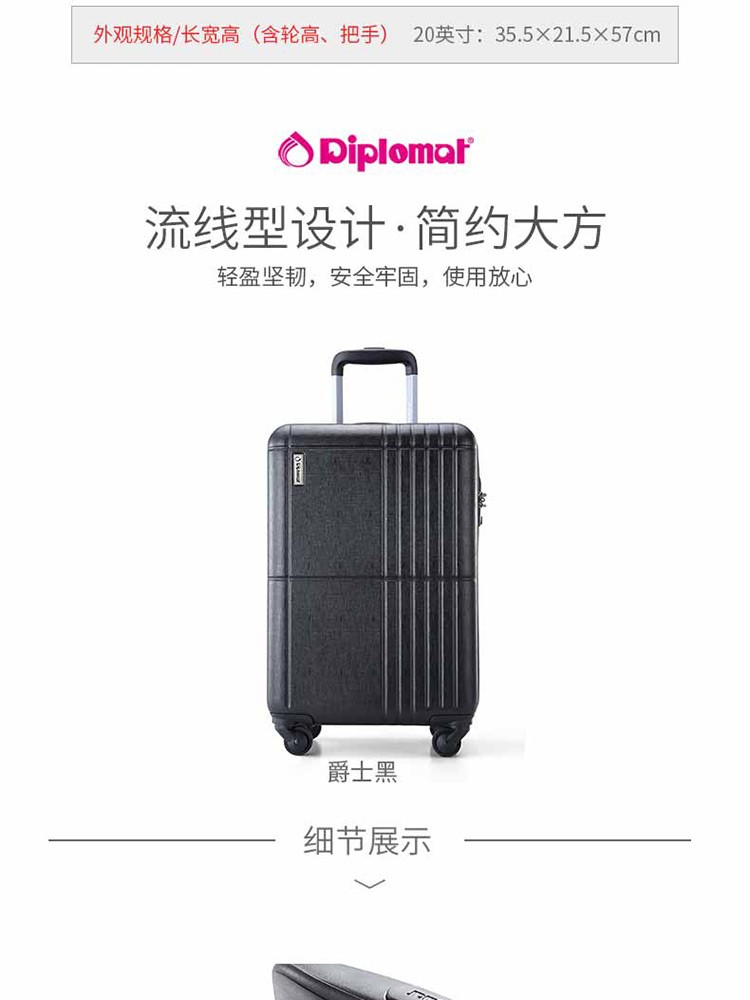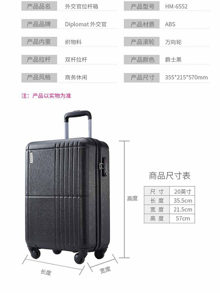 商品名称:外交官-HM-6552-拉杆箱-20英寸-爵士黑-单位:个