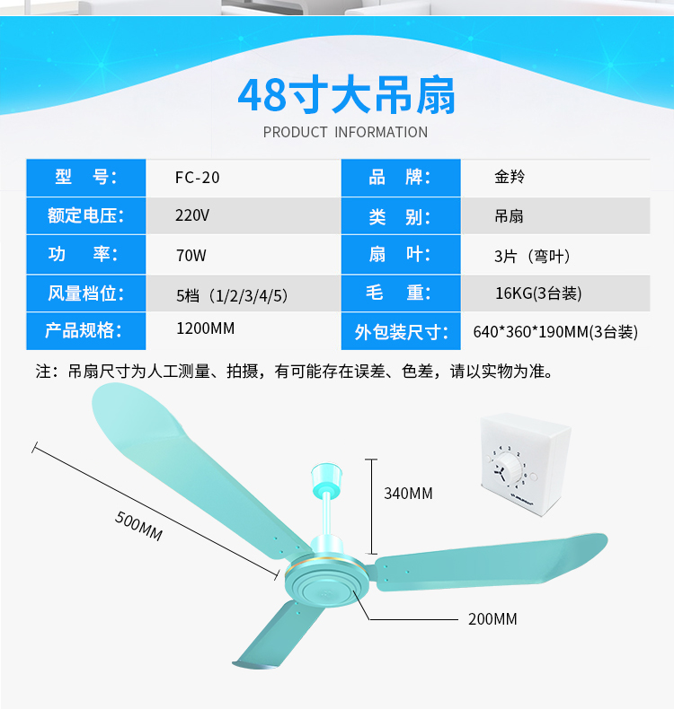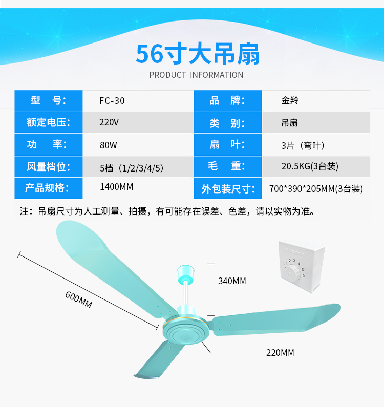 商品名称:金羚(JINLING)吊扇48/56寸吸顶扇/电风扇/楼顶扇/工业扇 铁叶 56英寸三叶 56寸【大机头】1.4米 白色