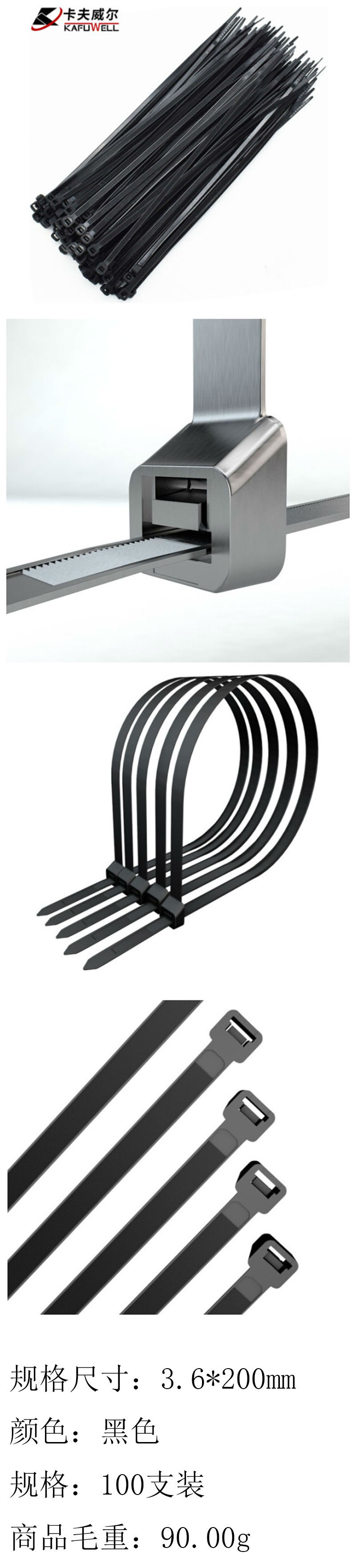 卡夫威尔 自锁式尼龙扎带小号工业扎丝 园艺扎线带 扎带理线带束线带捆扎带 3.6*200mm 黑色 100支装 OT2899G 10支起订 单位:支