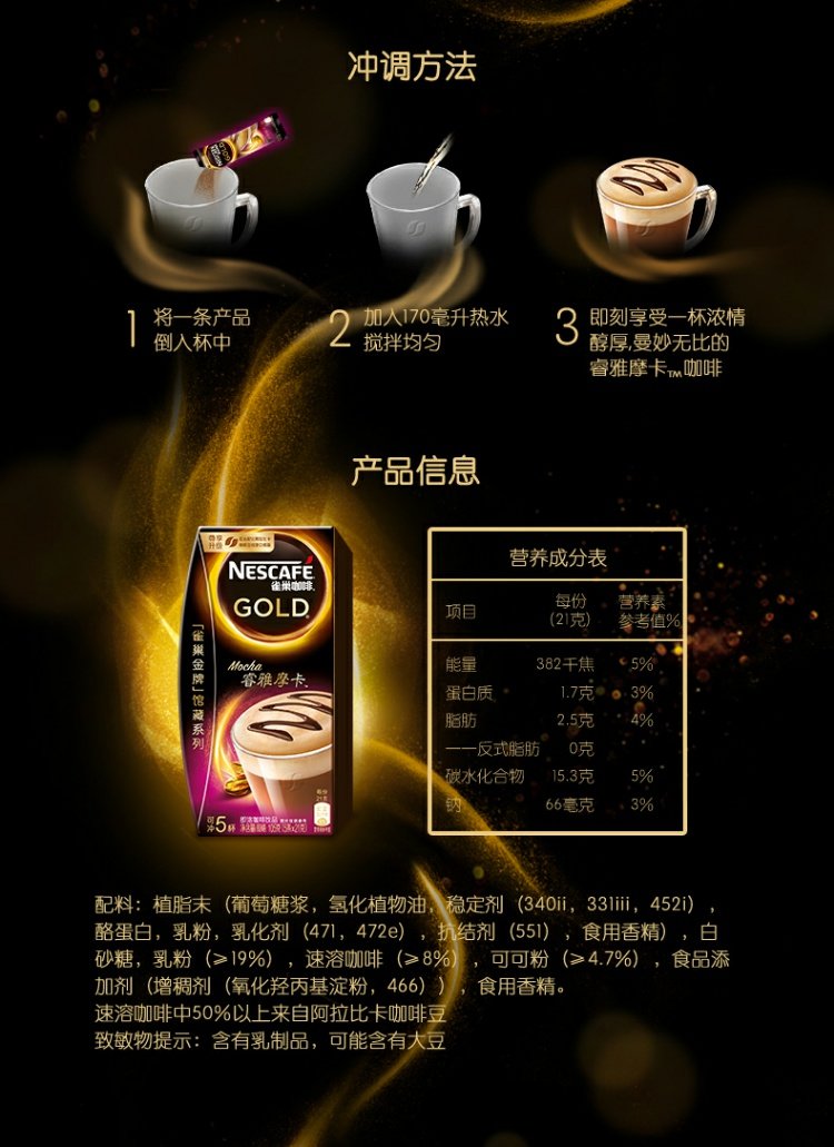 商品名称:雀巢 办公室咖啡金牌馆藏系列速溶咖啡摩卡咖啡5条装含可可粉