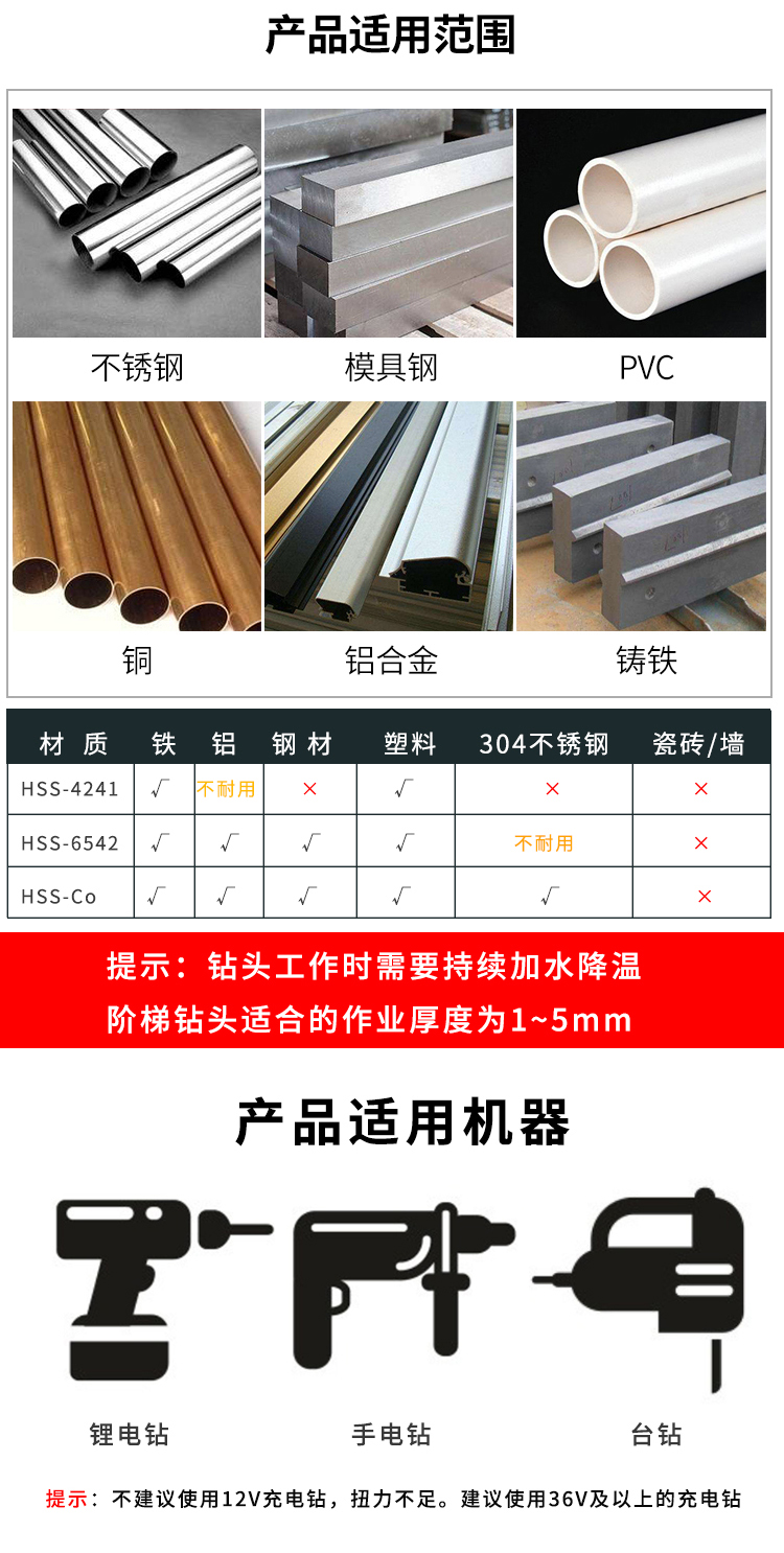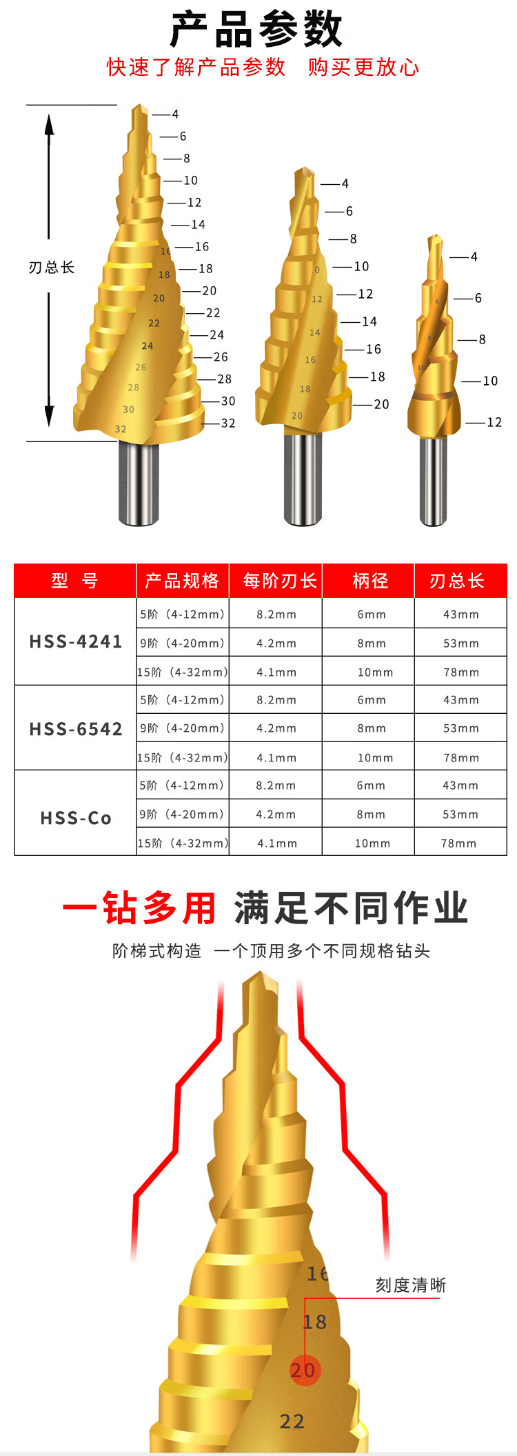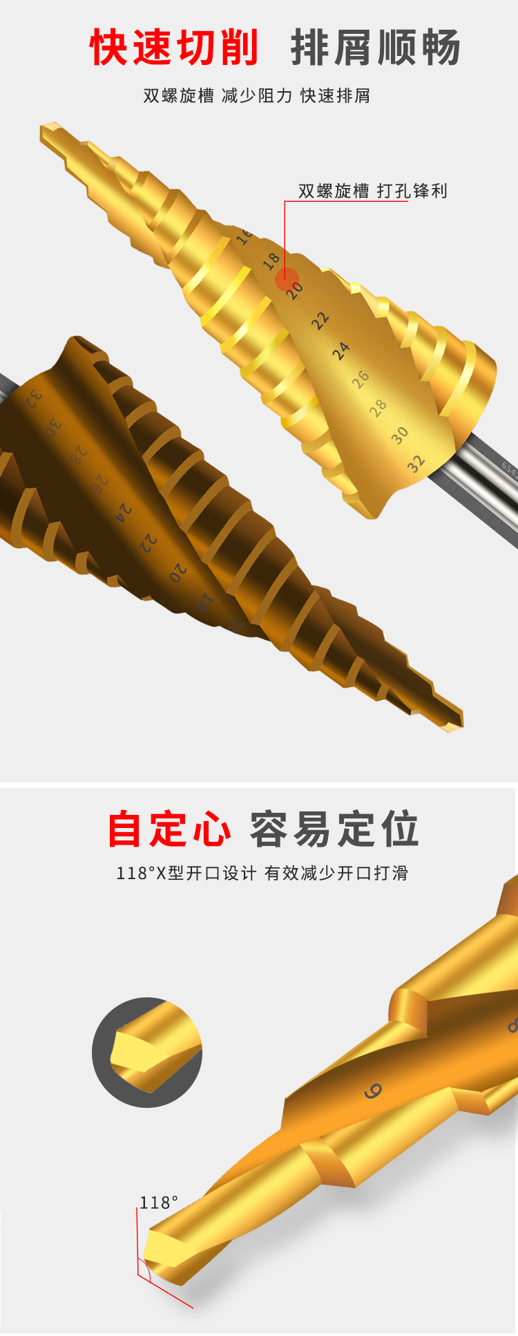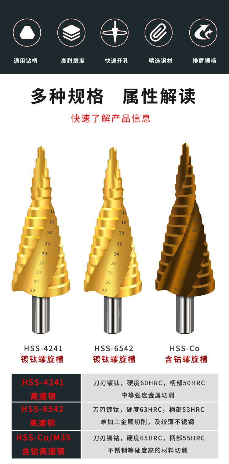 商品名称:卡夫威尔 多功能宝塔钻头阶梯钻锥形金属开孔器钻孔扩孔打孔器6542镀钛 4-20mm 螺旋槽 AI3507 单位:个 3个起订