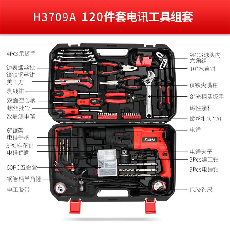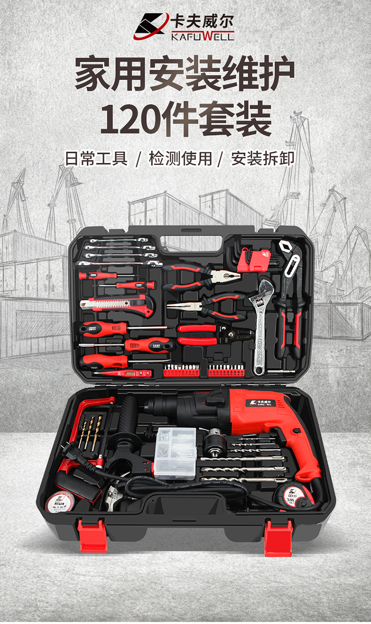 卡夫威尔 120件套电锤家用工具箱套装 轻型电锤套装500W大功率 水泥墙打孔安装维修家具 H3709A