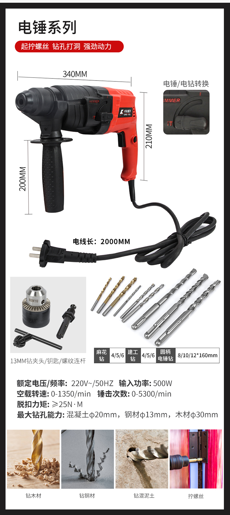 商品名称:卡夫威尔 120件套电锤家用工具箱套装 轻型电锤套装500W大功率 水泥墙打孔安装维修家具 H3709A