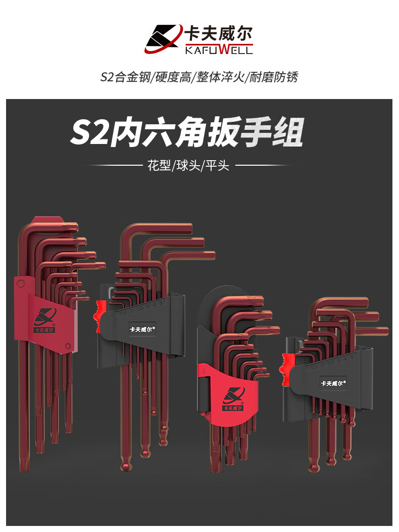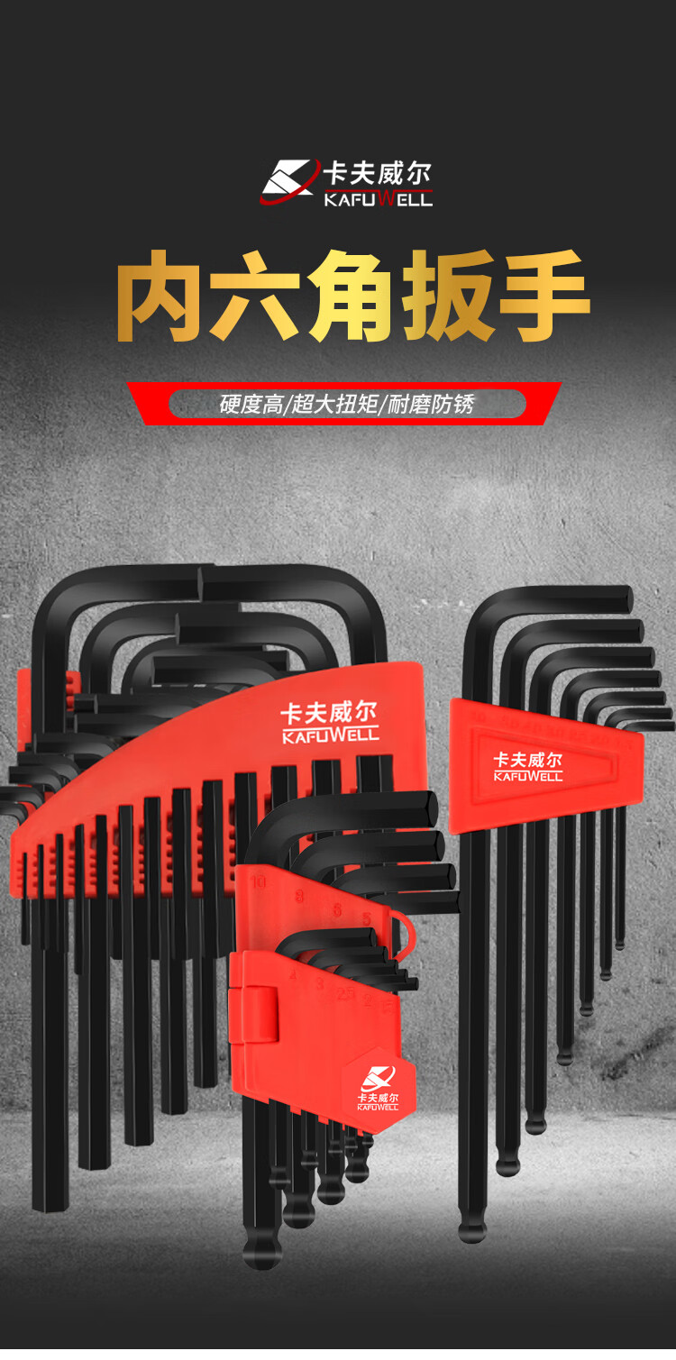 卡夫威尔 球头内六角扳手套装9件套公制 自行车扳手螺丝刀手动维修工具1.5-2-2.5-3-4-5-6-8-10 KH3586 单位:套 10套起订
