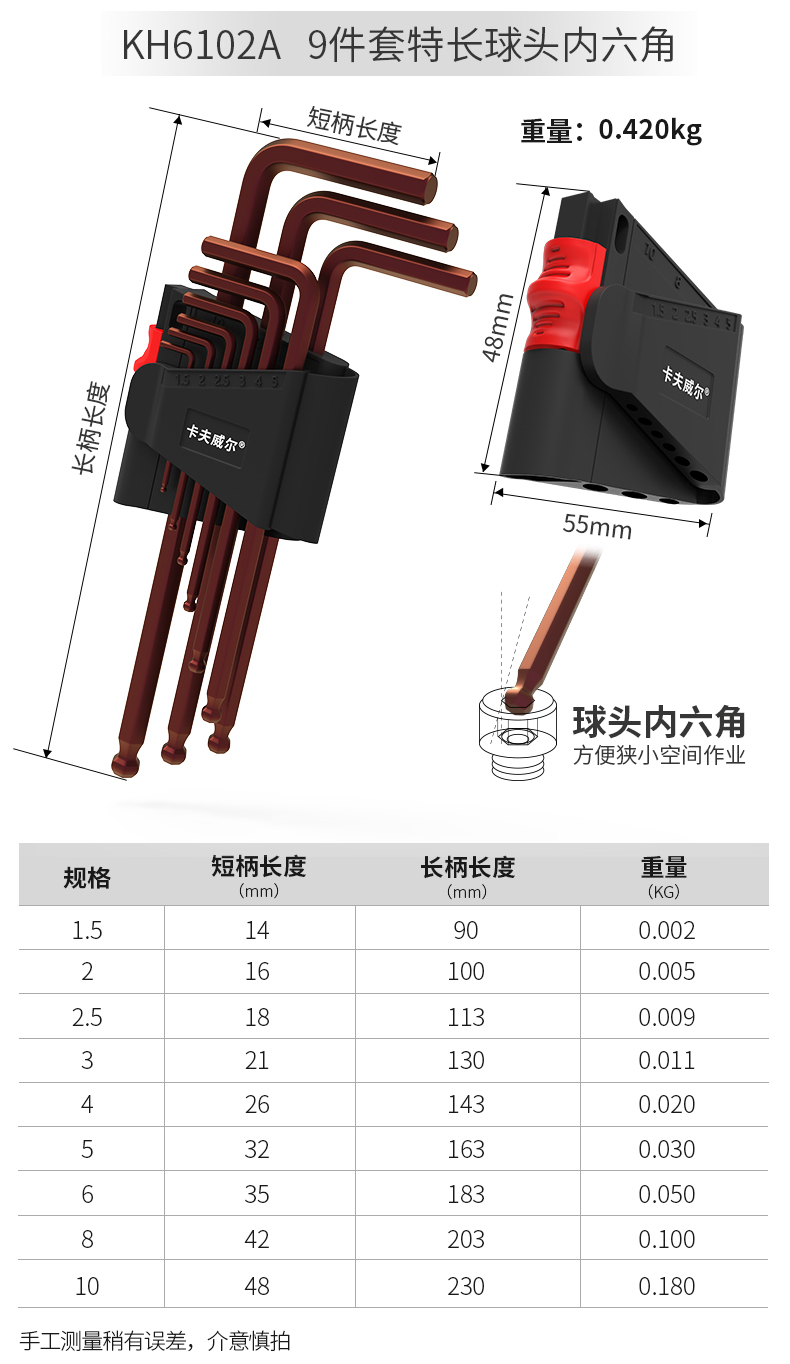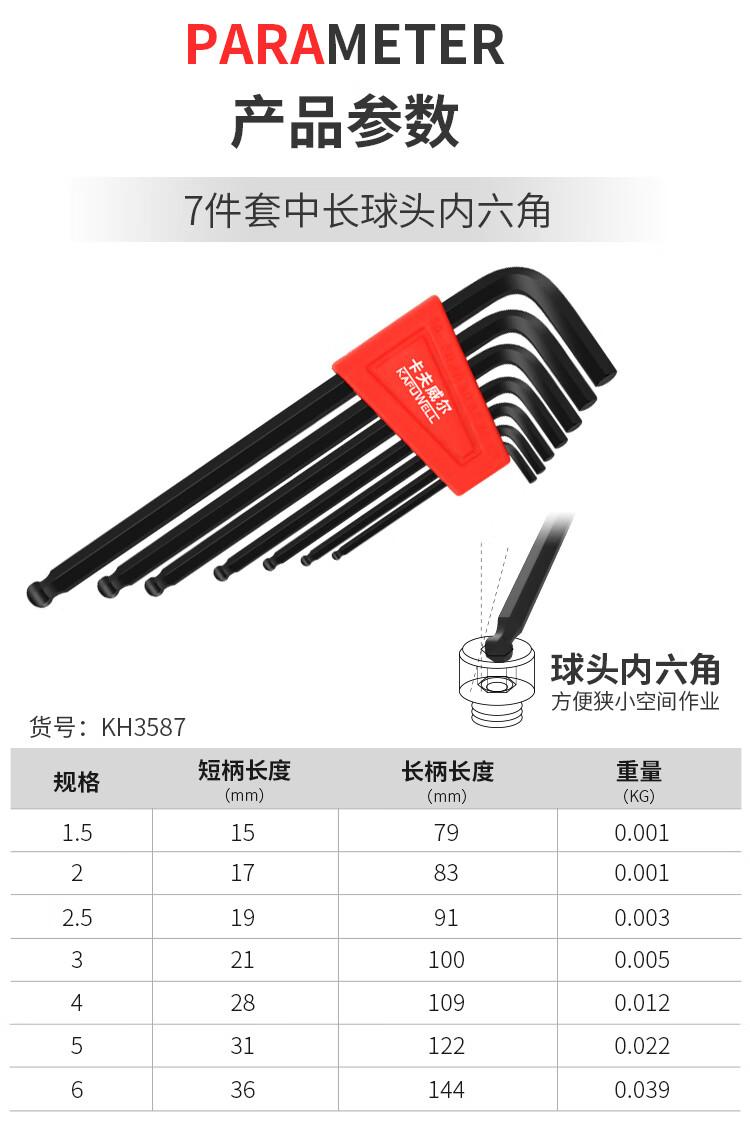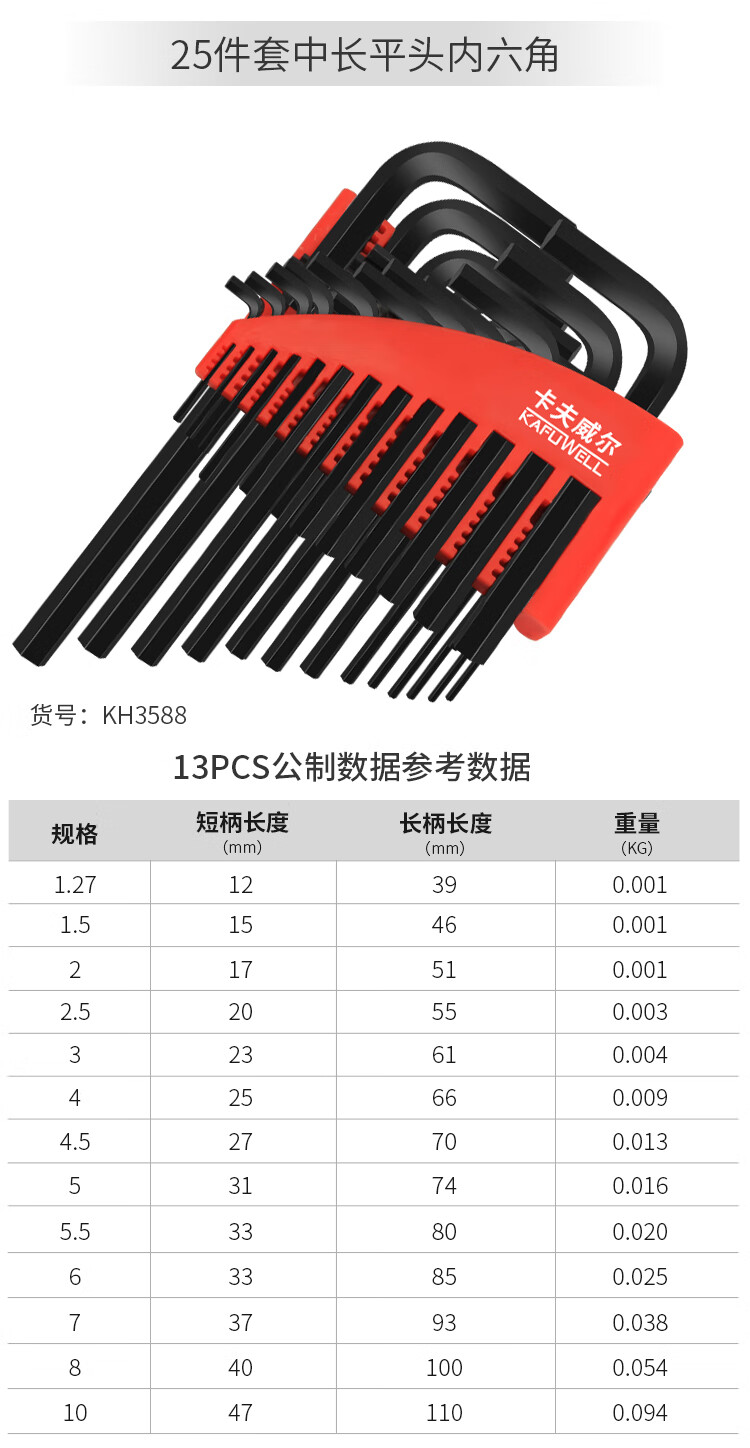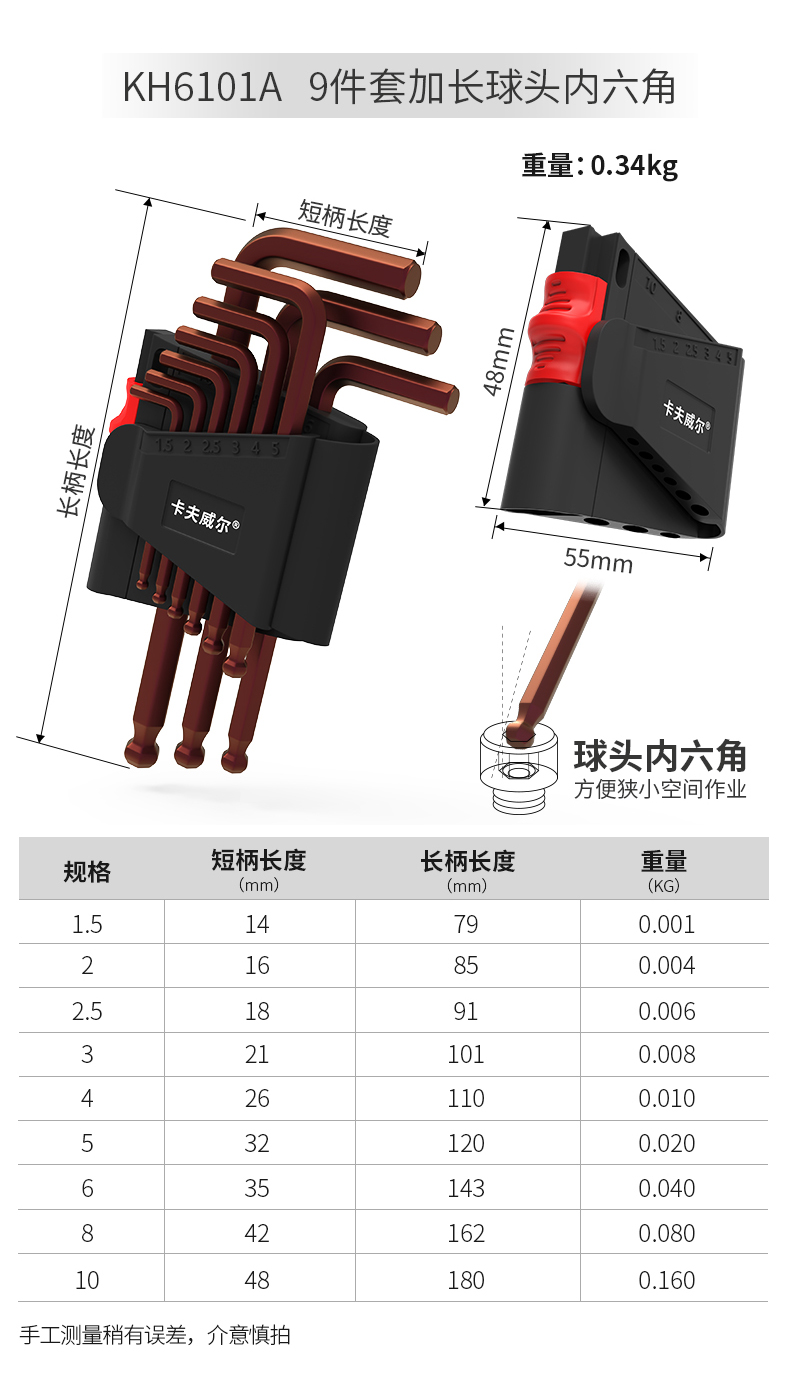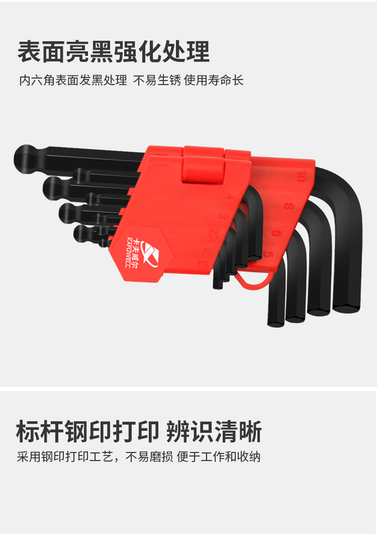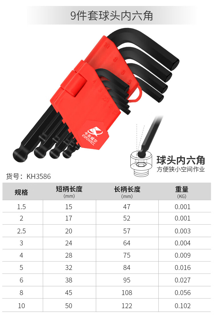 商品名称:卡夫威尔 球头内六角扳手套装9件套公制 自行车扳手螺丝刀手动维修工具1.5-2-2.5-3-4-5-6-8-10 KH3586 单位:套 10套起订