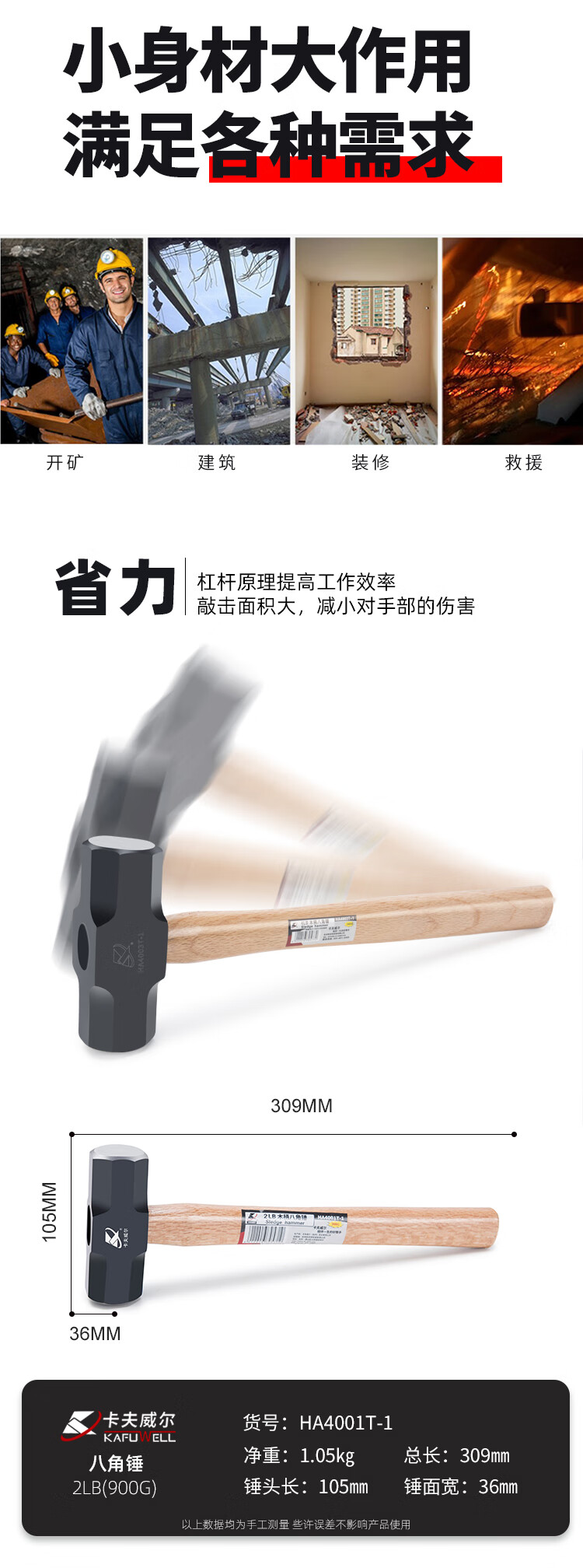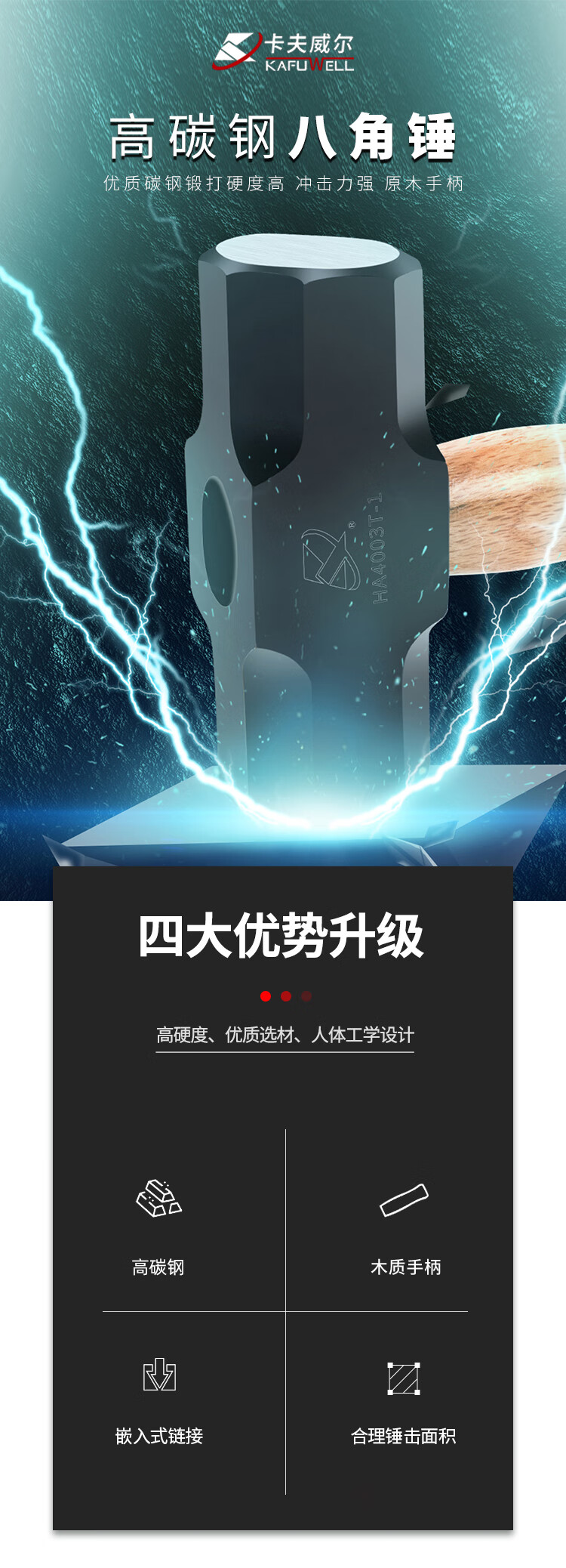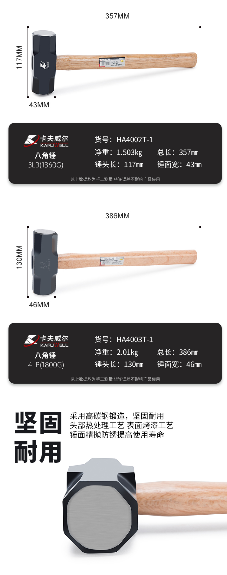 卡夫威尔 青冈木手柄八角锤子大铁锤铁匠锤砸墙铁榔头900G HA4001T-1