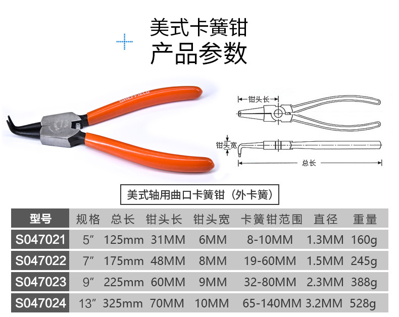商品名称:钢盾 SHEFFIELD S047003 德式轴用直嘴卡簧钳7英寸