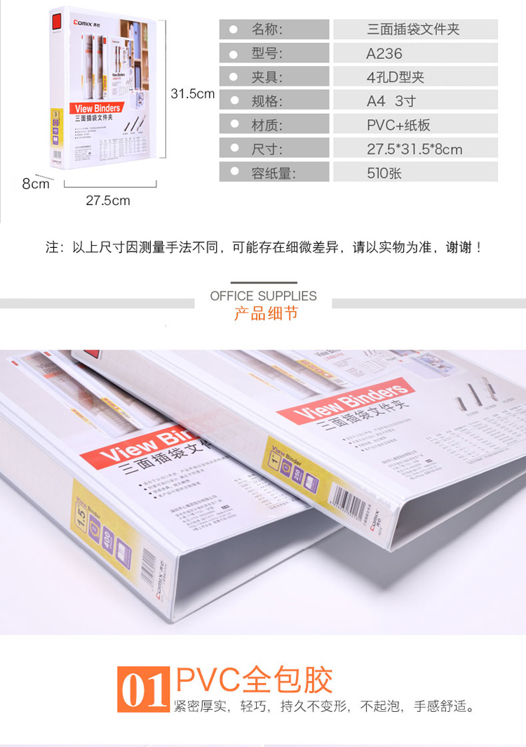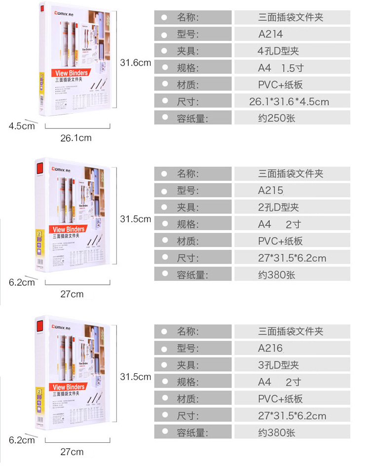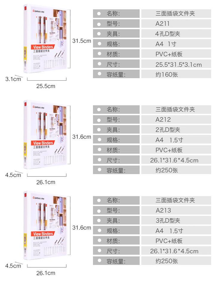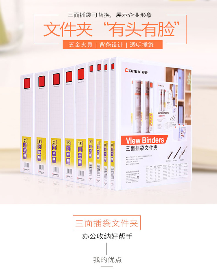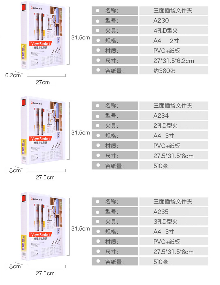 商品名称:齐心 A209 A210 A212 A216 A215 A234 A235三面插页A4活页夹加插封面打孔文件夹白夹快劳夹两孔三孔四孔档案夹