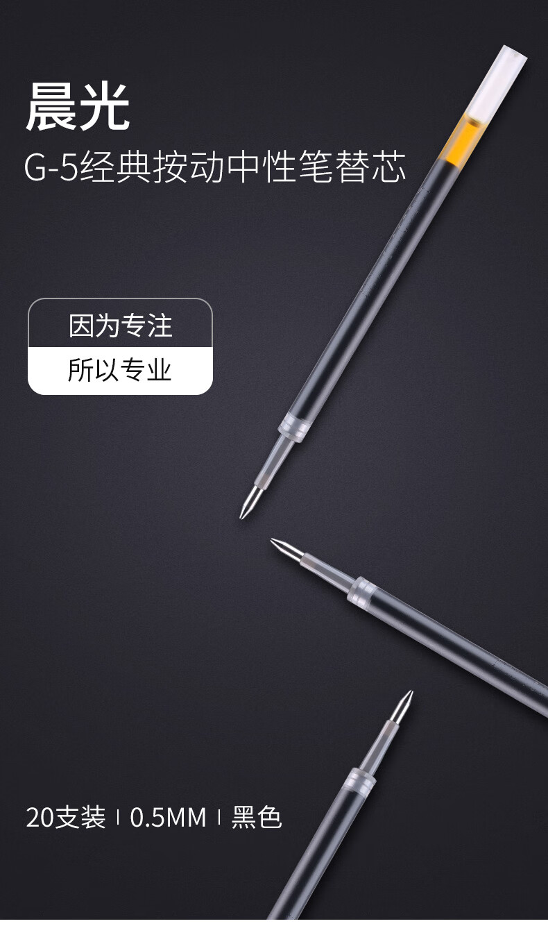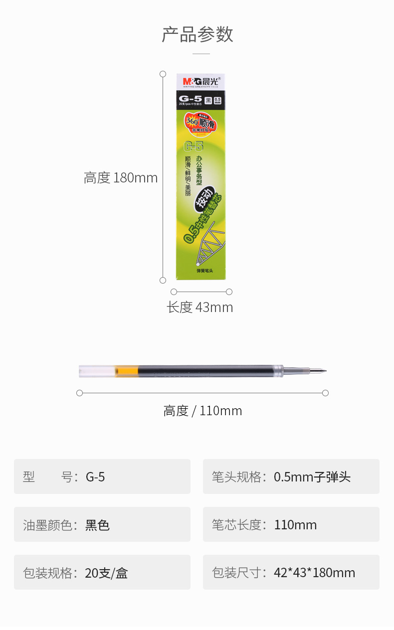 商品名称:晨光(M&G)黑色0.5mm按动子弹头中性笔芯 签字笔替芯 水笔芯(K35/S01/S08适用)40支/盒 G-5A 3盒起订 单位:盒