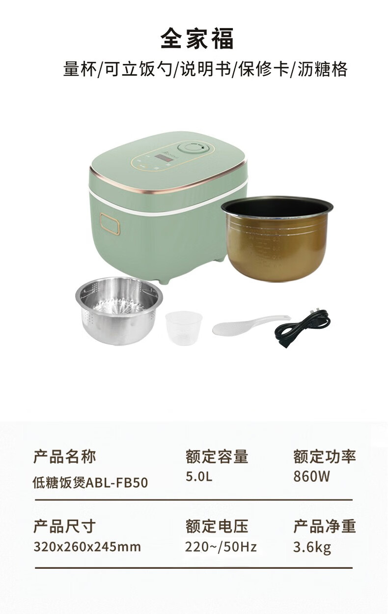 商品名称:艾贝丽低糖饭煲家用电饭锅5L大容量便捷操作式ABL-FB50 单位:个