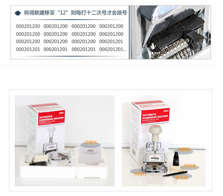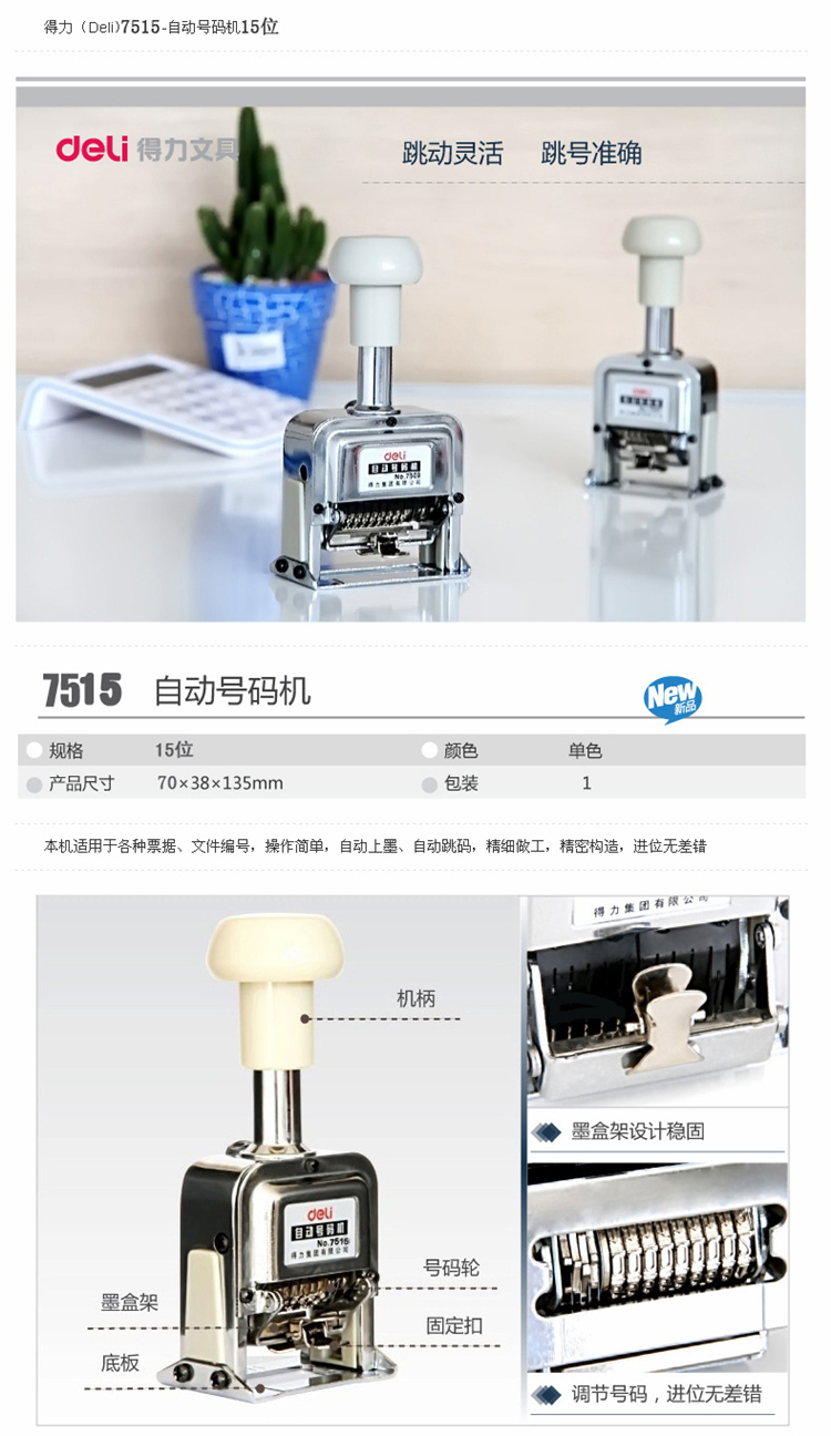 商品名称:得力 7515号码机 15位数字编号印章 自动号码机手动纸张打号机 1个